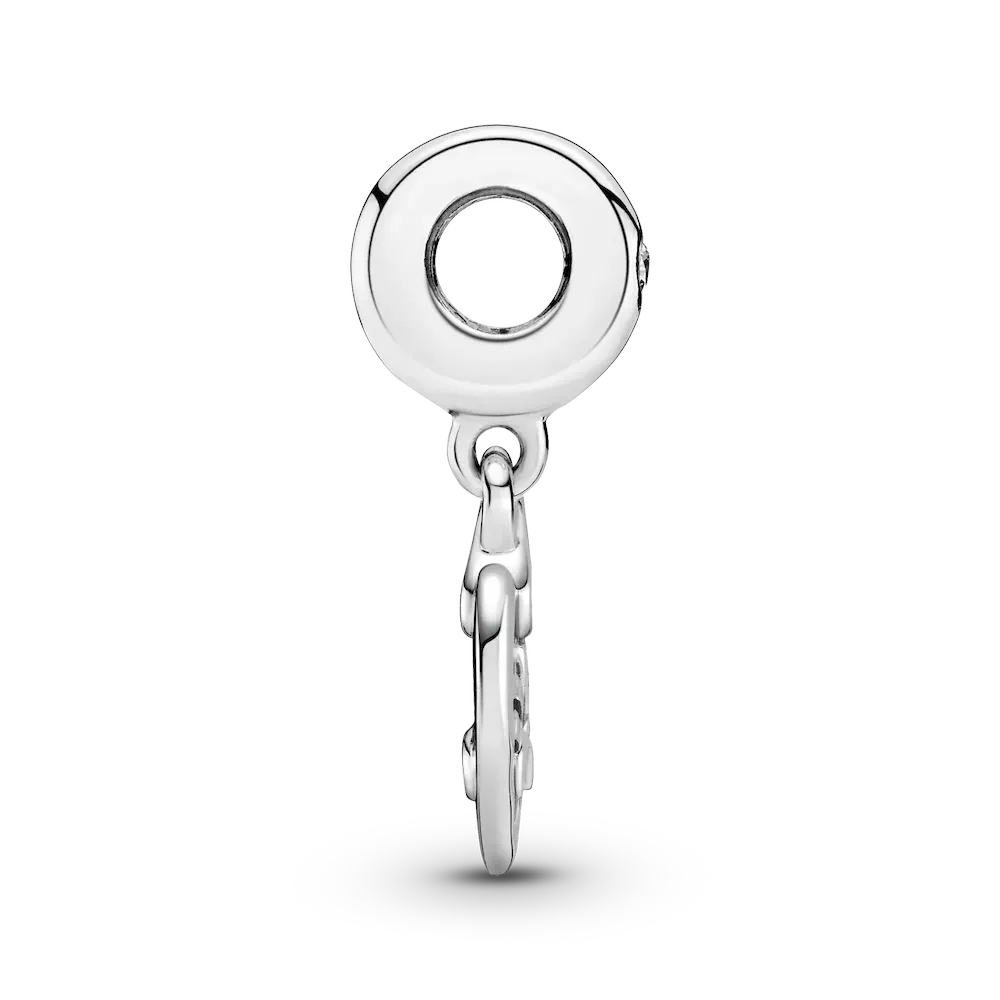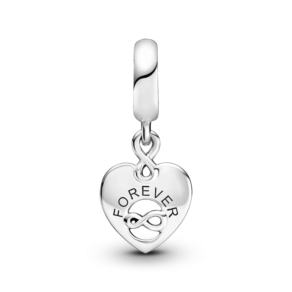 Discover a special charm for your BFF with the Friends Forever Heart Dangle Charm. Hand-finished in sterling silver, this heart-shaped dangle includes an asymmetric infinity sign cut-out with “Friends” in raised lettering on the front and the engraving “Forever” on the back. Another infinity sign connects the dangle with the bail, which features a sparkling clear stone. Let your bestie know that your friendship will last a lifetime with this piece.