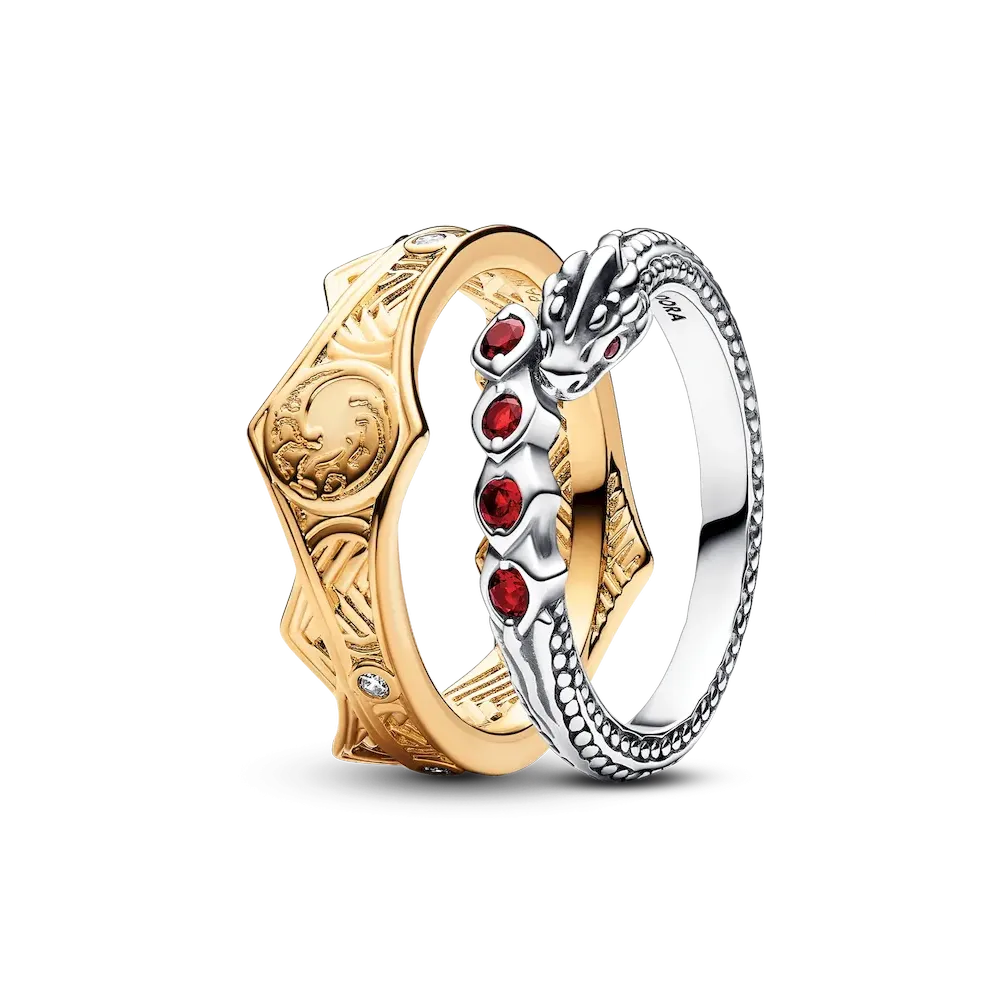 Unleash the power of Westeros with the Game of Thrones Ring Set. The Dragon Sparkling Ring brings the might of the dragon to your style, featuring a sterling silver shank shaped like a dragon with crystal eyes and a tail adorned with red lab-created crystals. The House of the Dragon Crown Ring honors the Targaryen legacy with its 14k gold-plated design, sparkling stones, and arch detailing, crowned by the iconic three-headed dragon sigil. Wear these rings together to show your allegiance to the Targaryens and add royal flair to any look.