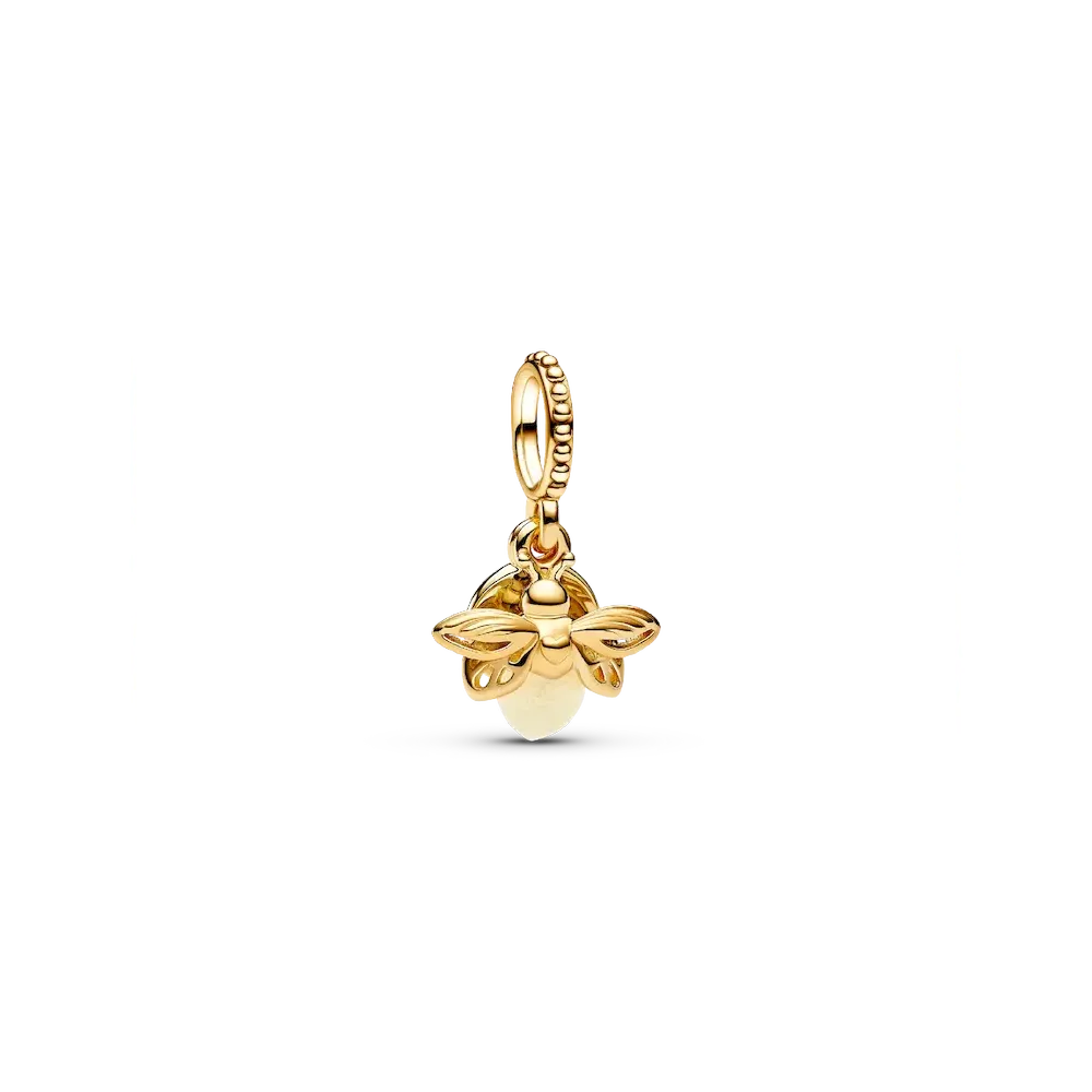 Light up your look with the Glow-in-the-dark Firefly Dangle Charm. This 14k gold-plated firefly charm features rounded glow-in-the-dark glass – white in the daylight and milky green at night – which recharges when exposed to sunlight or UV light. A second 14k gold-plated disc reads ‘You light up my life.’ This engraved charm makes the perfect gift for the one you love, or a stylish statement of self-love to remind you of the light you carry within.