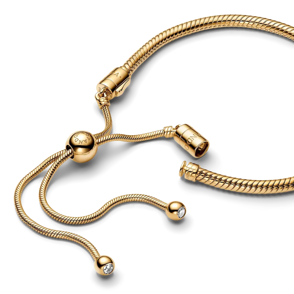 The Golden Love Script Charm Bracelet Set is a timeless expression of affection and connection. The Pandora Moments Snake Chain Slider Bracelet is crafted in 14k gold plating, featuring moveable end caps set with sparkling stones, and an adjustable sliding clasp for the perfect fit. A beautiful gift for any loved one, it can be personalized with your favorite charms. Paired with the Golden Love Script Charm, this charm is made from 14k gold plating and features the word “love” in a handwritten-style design, with the “o” shaped like a heart— a heartfelt tribute to the power of love. A perfect set to celebrate those who hold a special place in your heart.