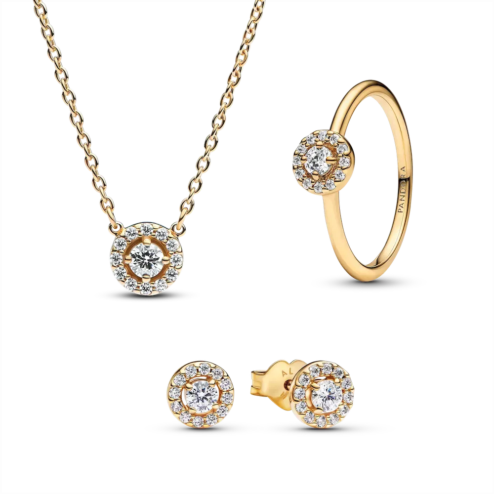 Illuminate your collection with the Golden Pave Halo Jewelry Set, a stunning ensemble that radiates elegance and sophistication. This set includes a matching ring, necklace, and stud earrings, all featuring a captivating circular motif design adorned with hand-set pave cubic zirconia stones. Crafted in 14k gold-plating with a luxurious finish, this jewelry set is perfect for elevating any outfit, whether for special occasions or everyday wear. Gift yourself or a loved one this exquisite set and embrace timeless beauty and style!