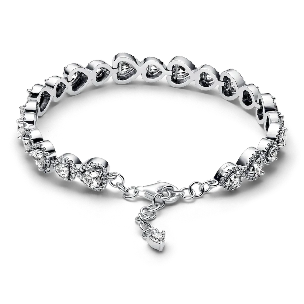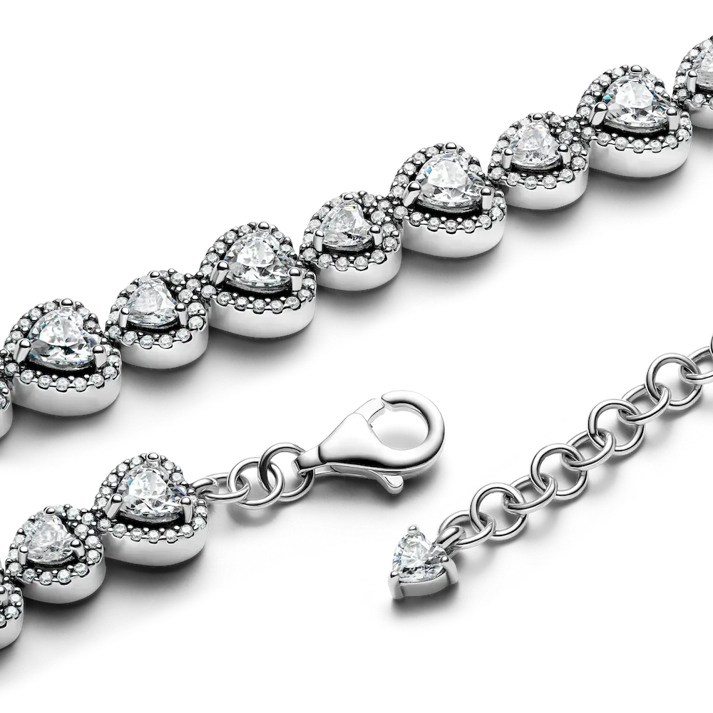 Connected by love. 23 heart-shaped stones in alternating sizes are surrounded by halos of 363 micro bead-set cubic zirconia, bringing new levels of sparkle and romance to the classic tennis bracelet silhouette. Give this special piece to the one in your life who loves love (yourself included).