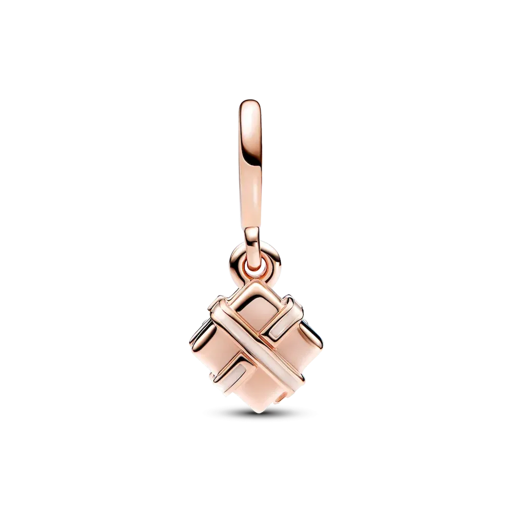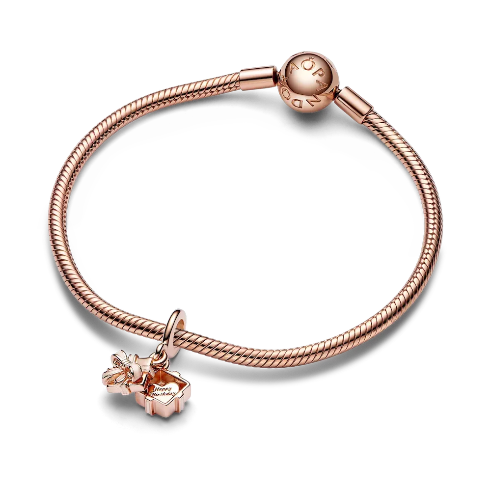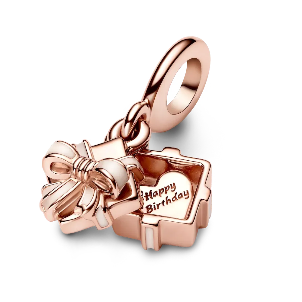 A sweet gift to make your loved one’s birthday even more special. The Openable Birthday Gift Dangle Charm is finished in warm 14k rose gold plating and is shaped like a gift box with a soft pink enamel ribbon and bow. Open the box and you’ll discover a raised heart with the engraved message