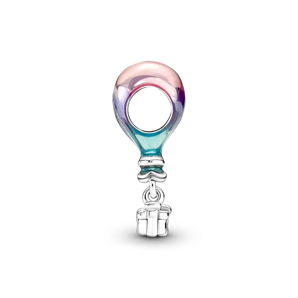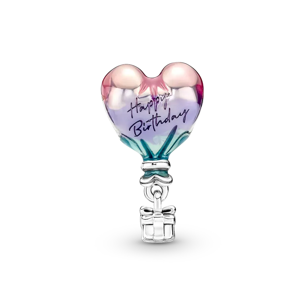 Let their spirit soar with this Happy Birthday Hot Air Balloon Charm. Hand-finished in sterling silver, the heart-shaped balloon is lovingly coated in transparent purple, pink and blue enamel with creases to add a touch of realism. A small 3D gift box dangles from the balloon with ribbon detailing. The perfect gift for adventure seekers.