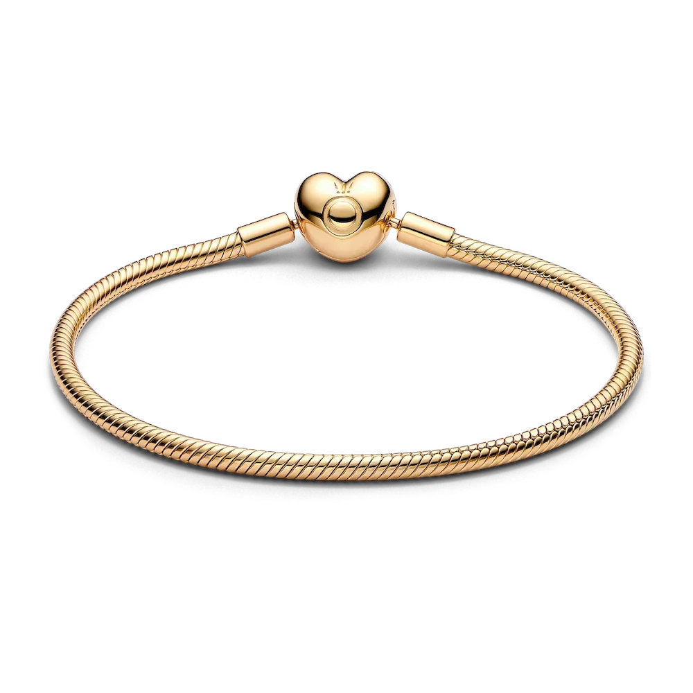 Our iconic snake chain bracelet gets a shining update. The heart-shaped clasp of this 14k gold-plated bracelet includes an engraved Pandora logo on one side and the iconic Pandora Crown O on the other.