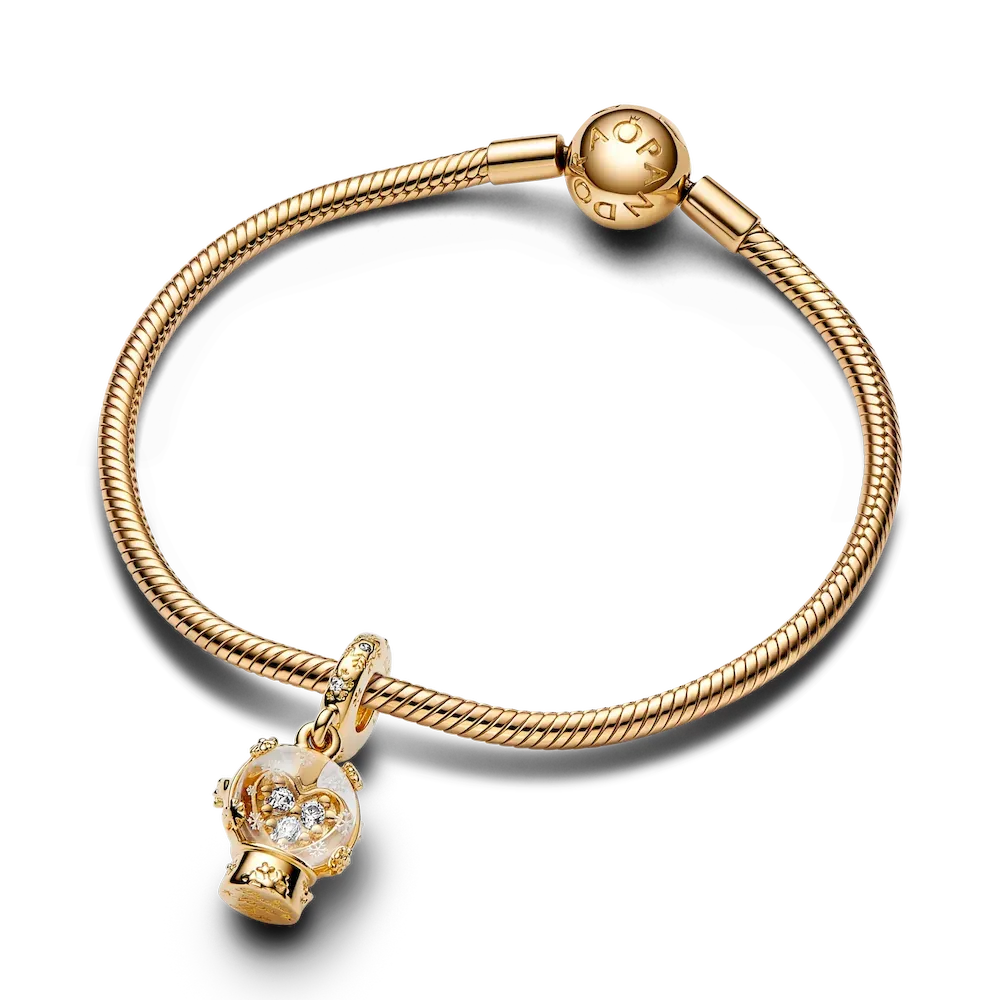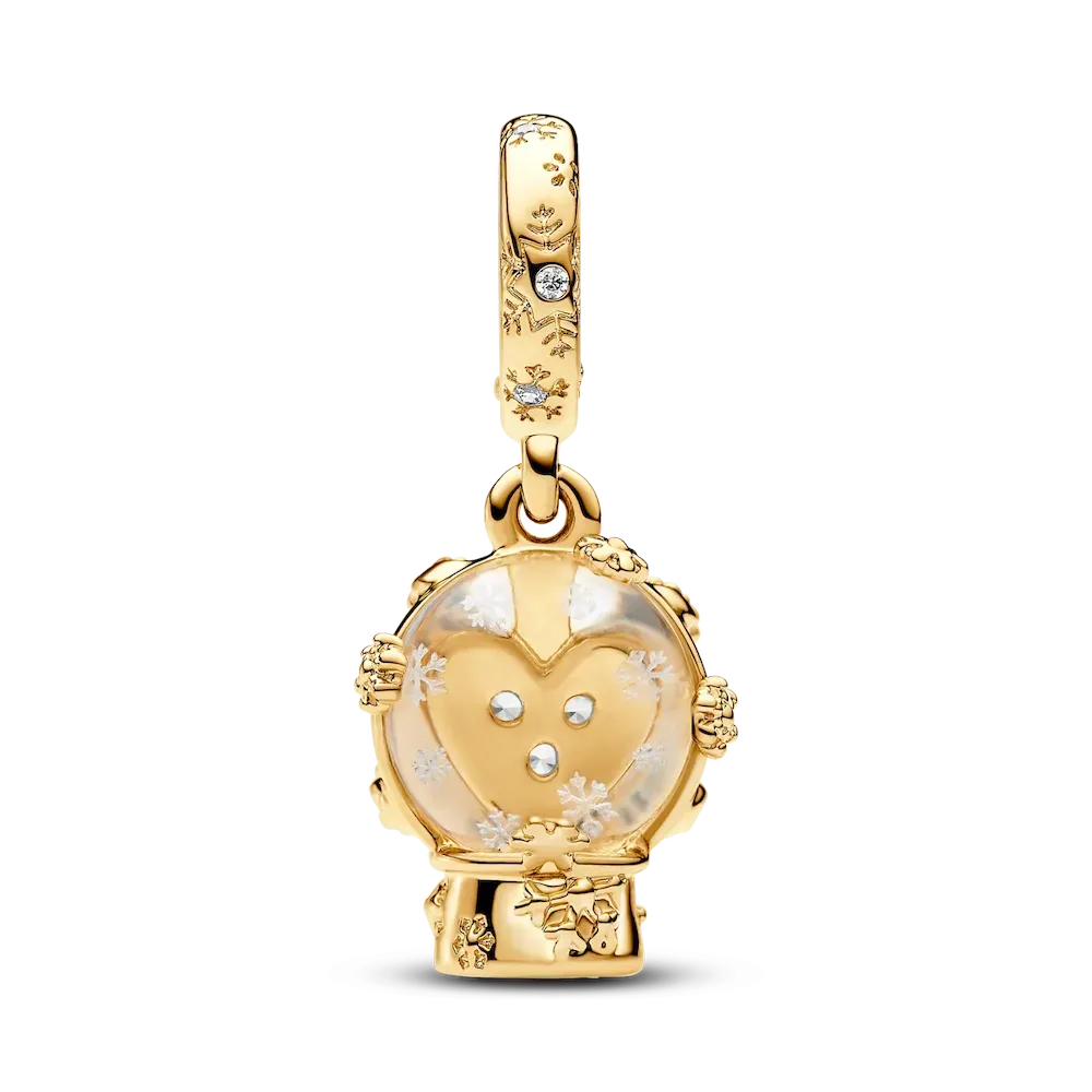 Embrace the nostalgia of festive days of old with the Heart Snowflake Snow Globe Dangle Charm. Plated in 14k gold, this Murano glass snow globe charm features engraved snowflakes that capture the beauty of a winter wonderland. The snow globe is inspired by our existing sterling silver snow globe charm with a new twist: it features a heart inside the Murano glass with three clear cubic zirconia stones. This special festive charm adds the perfect touch of sparkle to any look – just in time for the holidays.