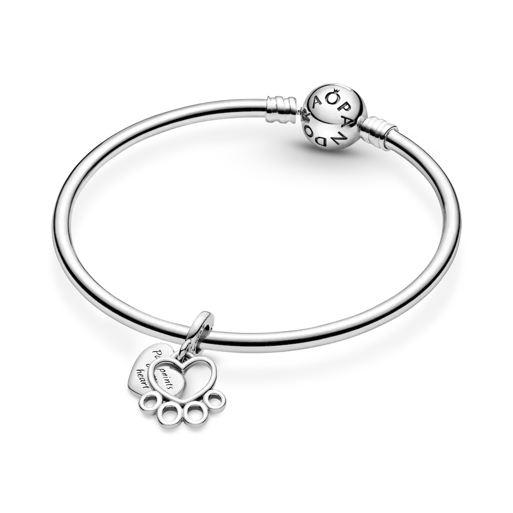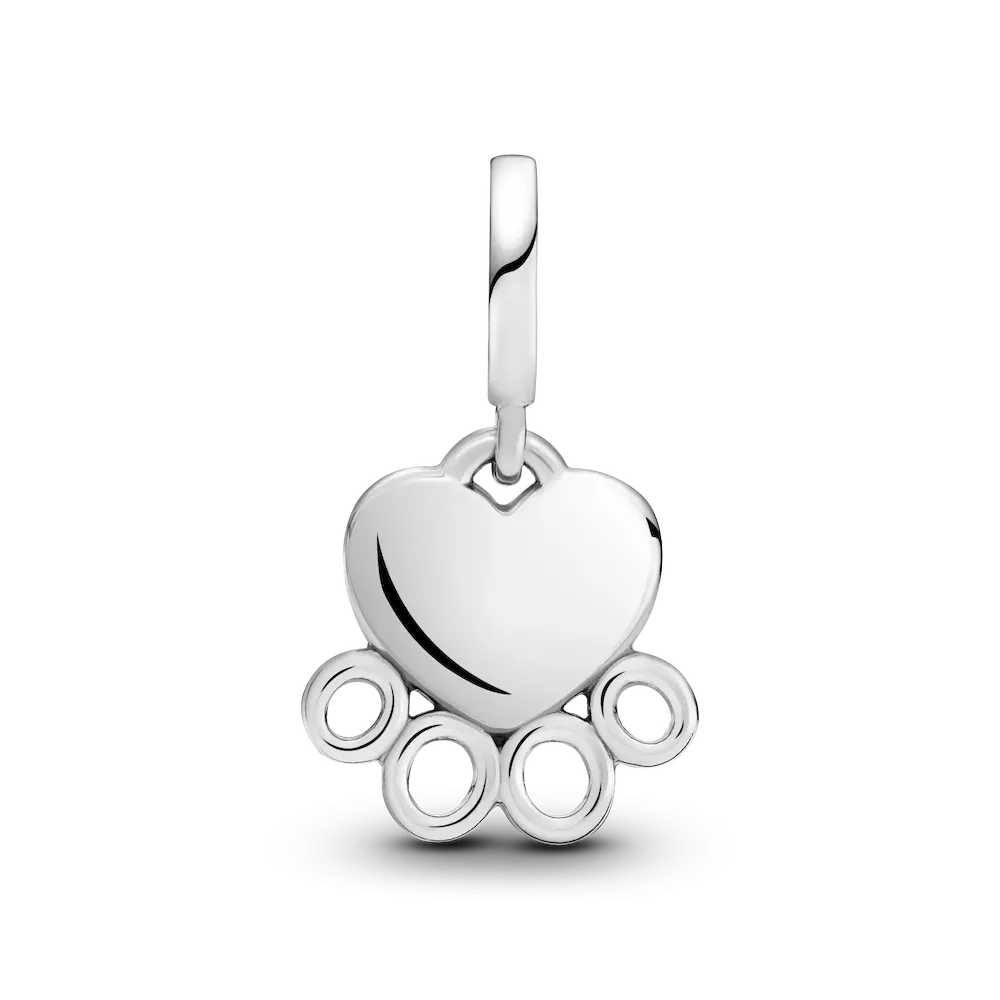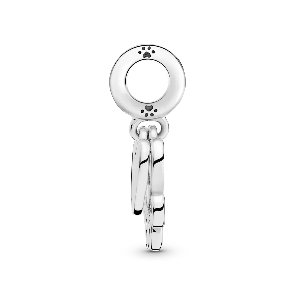 Wear a tribute to beloved pets with the Hearts & Paw Print Dangle Charm. Hand-finished in sterling silver, this paw print charm features a dangling open paw silhouette with a heart-shaped center and four toes, as well as a solid heart-shaped disc with a ‘Paw prints on my heart’ engraving. The bail on this pet charm features two paw stamps on each side for an extra dose of cuteness. Animal lovers, this charm will win your heart.