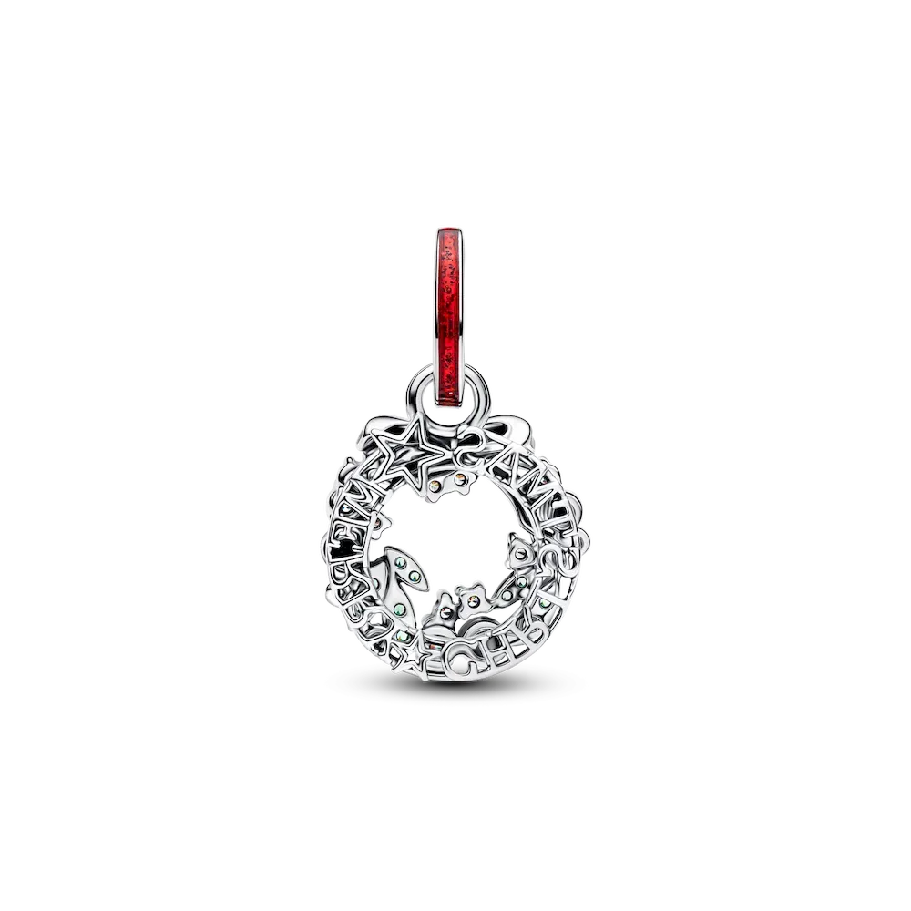 Wrap your heart in the spirit of the season. Our sterling silver wreath charm comes dressed in green man-made crystals and red glitter enamel – a playful way to spread holiday cheer.