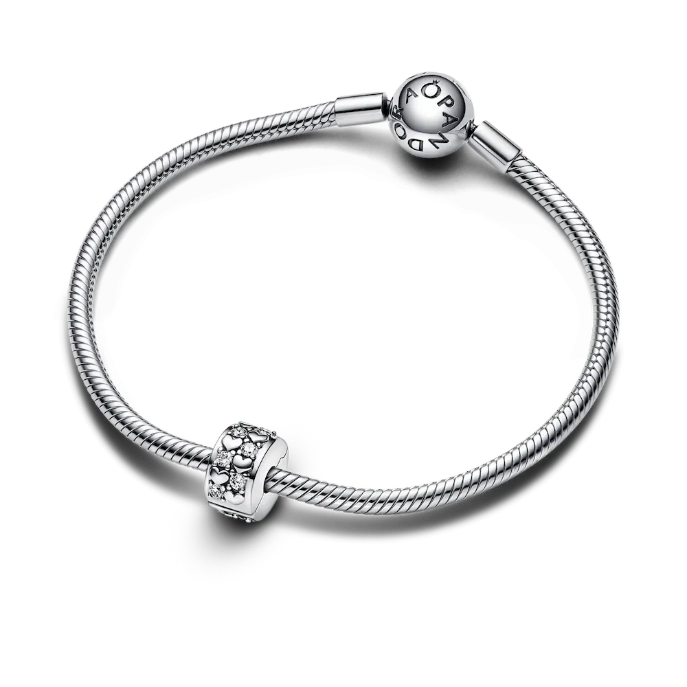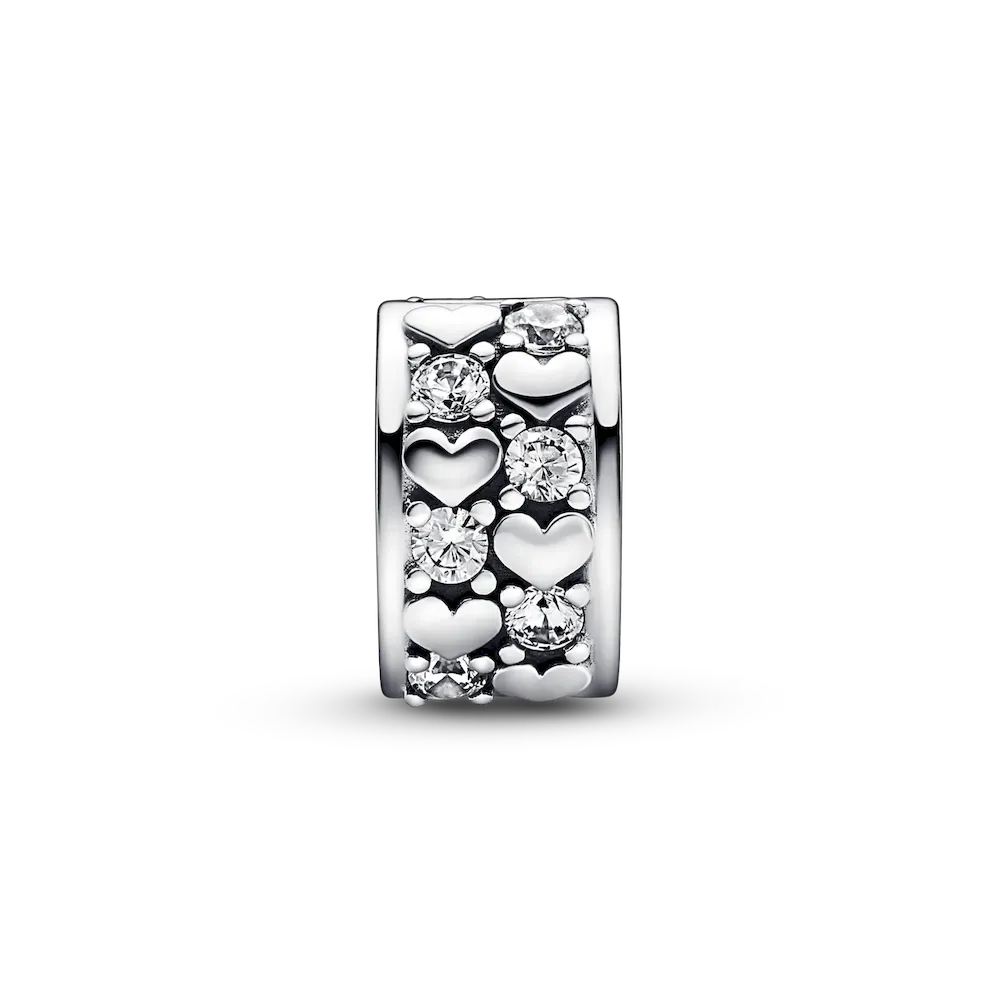 Secure your charms and keep them safe with this symbol of love. Crafted in sterling silver, the Infinite Hearts Sparkling Clip Charm features two rows of raised hearts with sparkling stones for a more elevated look. Wear it on your bracelet and let your favorite charms stand out. Please note: this clip charm features a silicone grip and does not fit over threads (the two raised charm dividers).