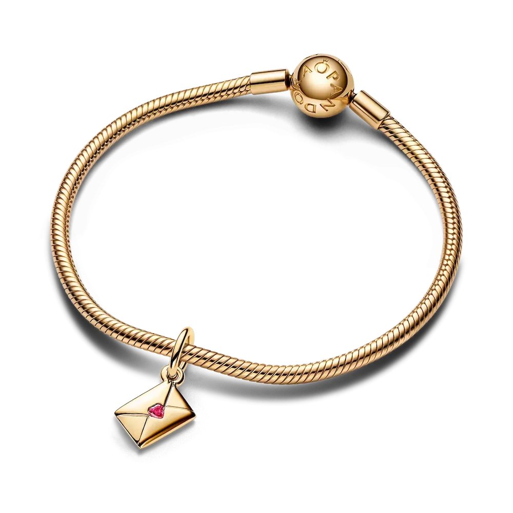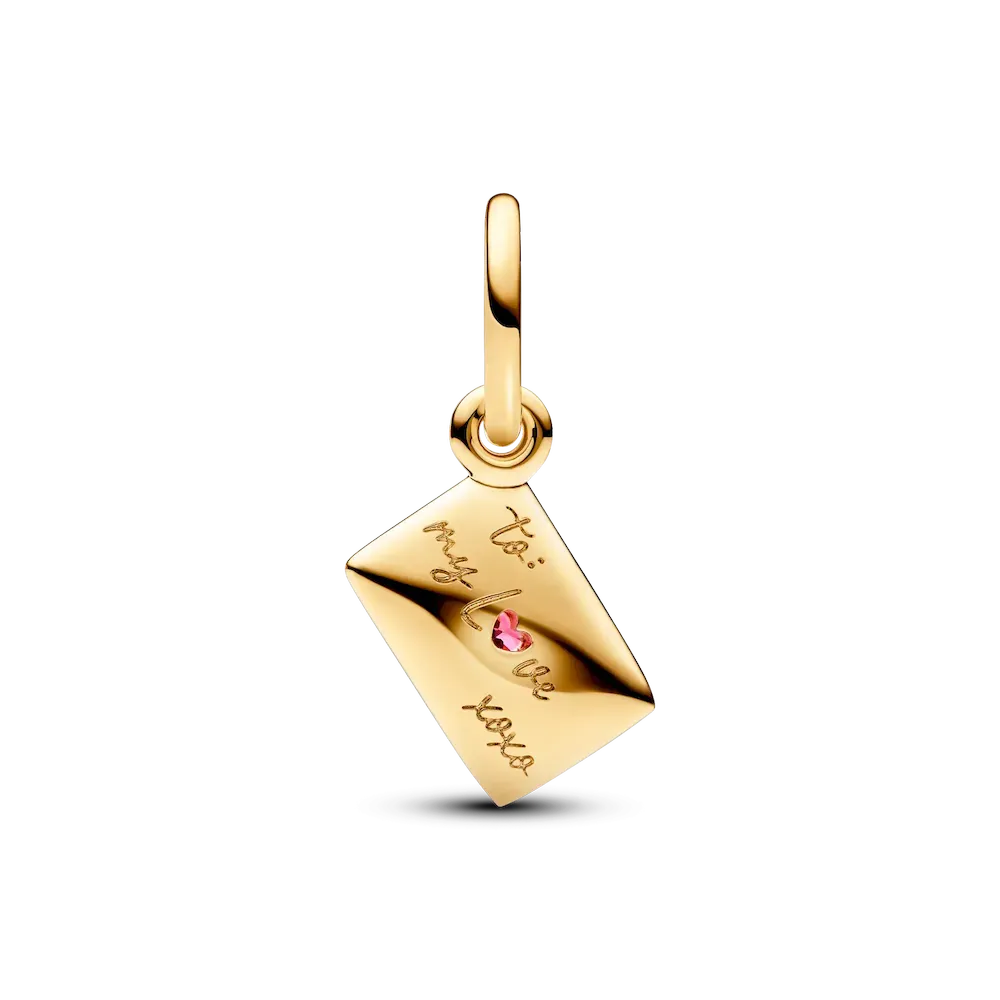 Send a note to the one you love with the Love Letter Envelope Dangle Charm. Inspired by a handwritten love note, this 14k gold-plated charm is shaped like an envelope dangling on an angle with realistic fold details. A heart-shaped red cubic zirconia stone represents the seal on the envelope; turn the charm around to find the engraved message