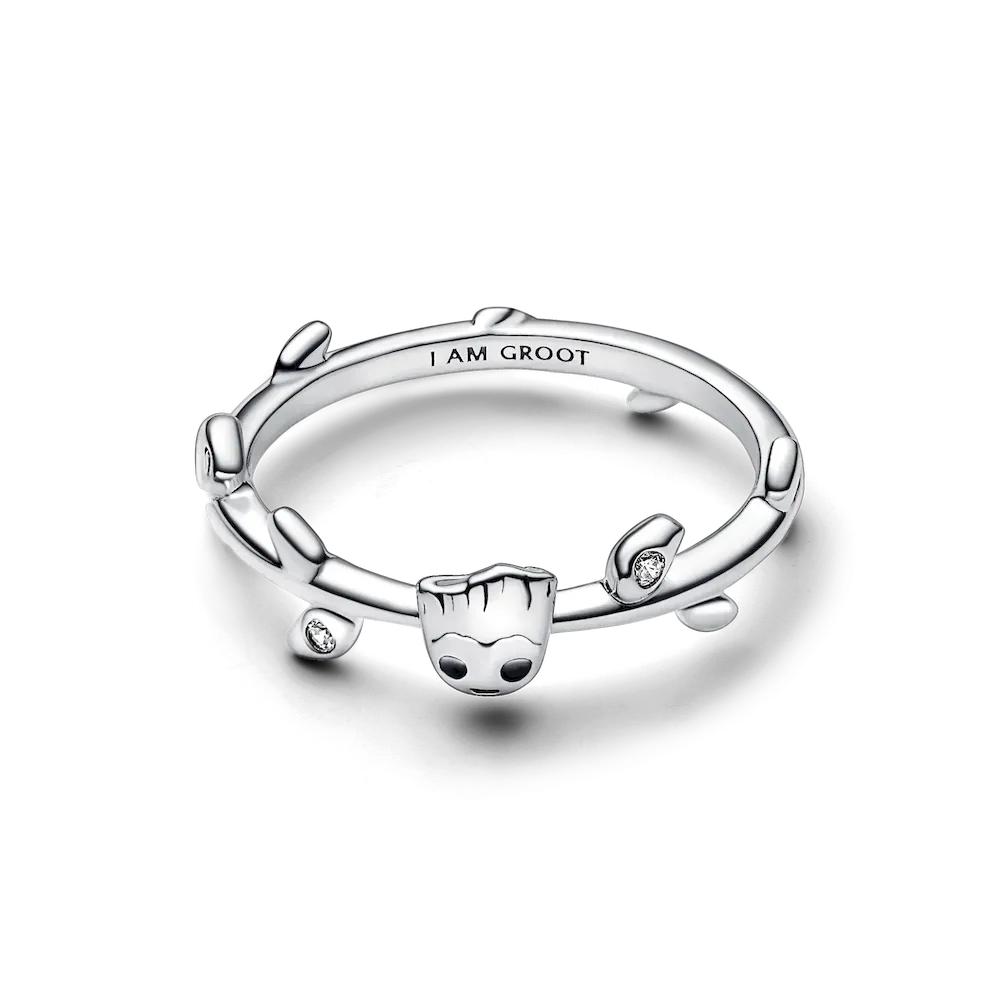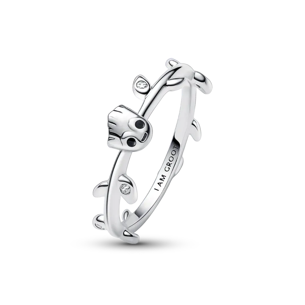 Find the hero within yourself with our Marvel Guardians of the Galaxy Groot Leaf Ring. Hand-finished in sterling silver, it features Groot’s sweet, smiling face at its center and leaves around its band. Adding depth and sparkle, Groot’s eyes are detailed with hand-applied black enamel and four of the leaves are flush-set with clear cubic zirconia. The only thing he ever says,