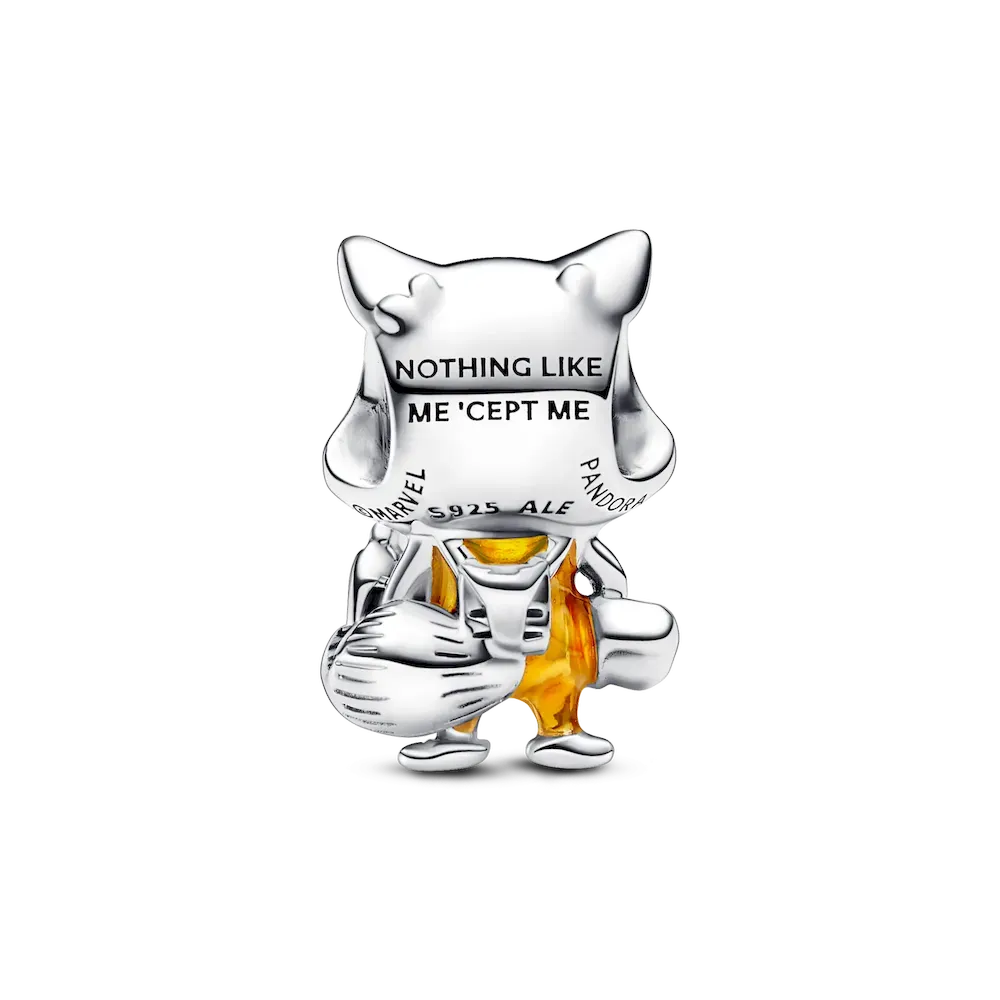Our Marvel Guardians of the Galaxy Rocket Raccoon Charm. An expert pilot and marksman, Rocket poses with his Laser Cannon and Aero-Rigs jetpack. He is crafted in sterling silver with hand-applied enamel detailing to accentuate his jumpsuit and grumpy demeanor. His tail, lined with grooves to give it a fur-like look, curls around his body. Engraved with