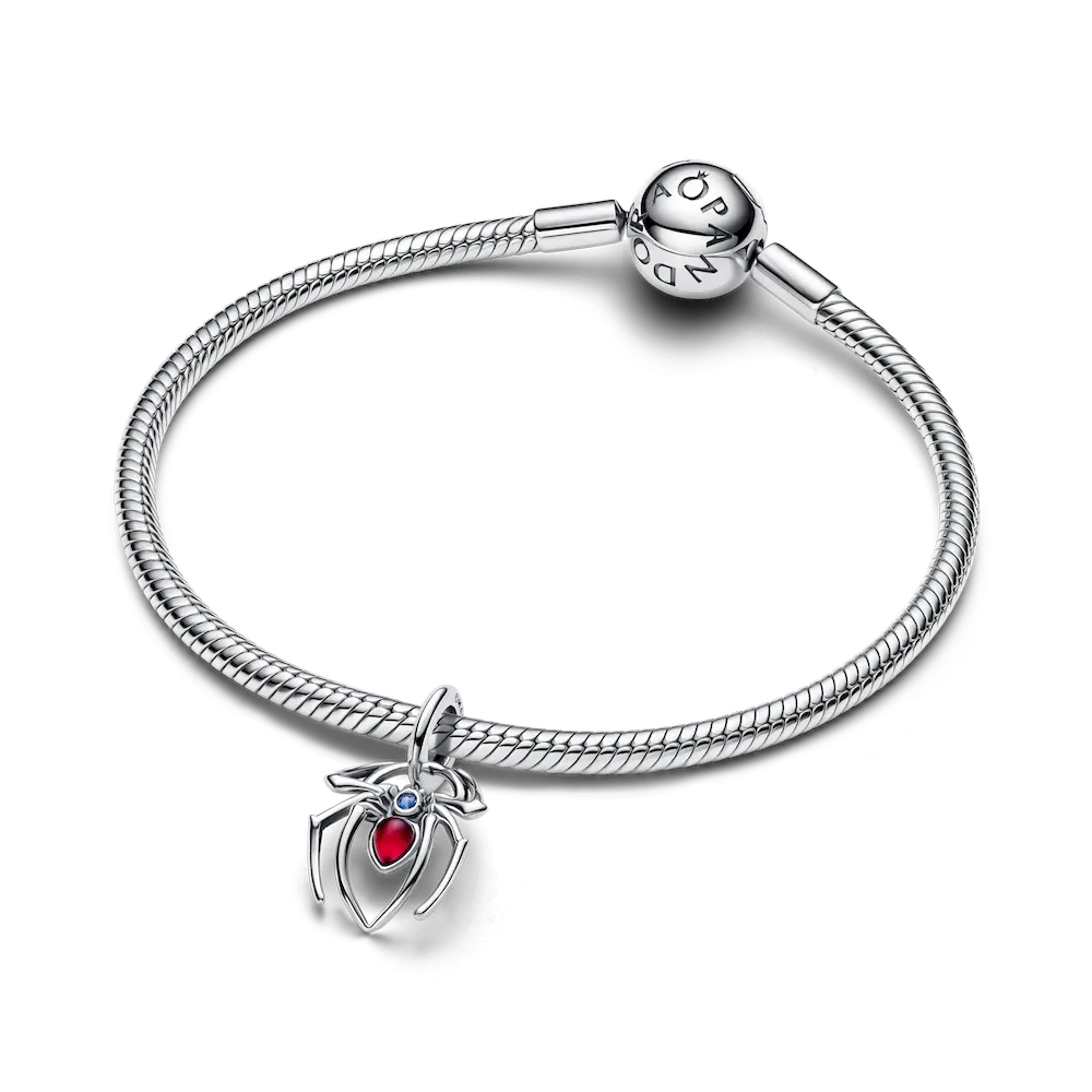 Swing into style with the sterling silver Marvel Spiderman Dangle Charm. Featuring blue and fuchsia man-made crystals, its openwork design captures resilience and strength. Perfect for adding a pop to your collection.