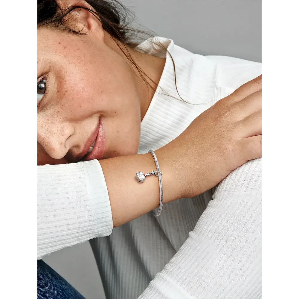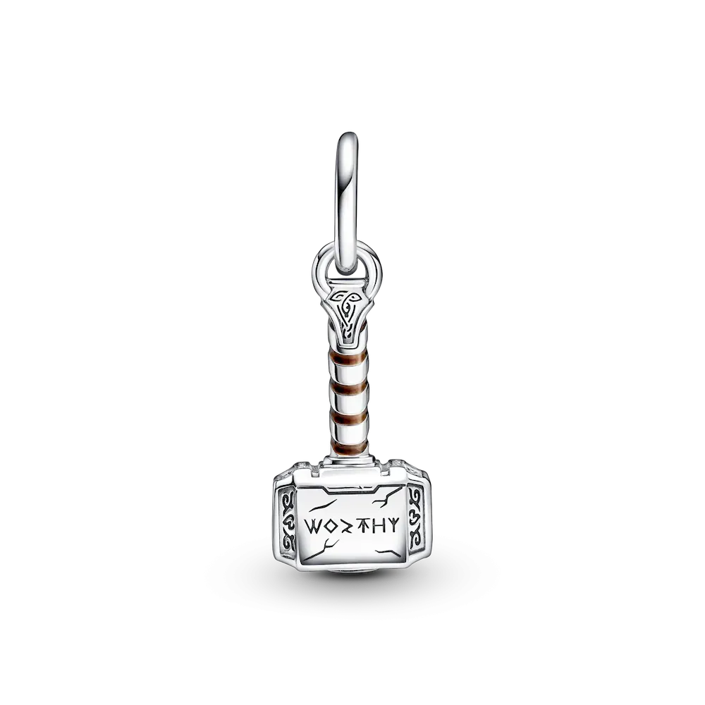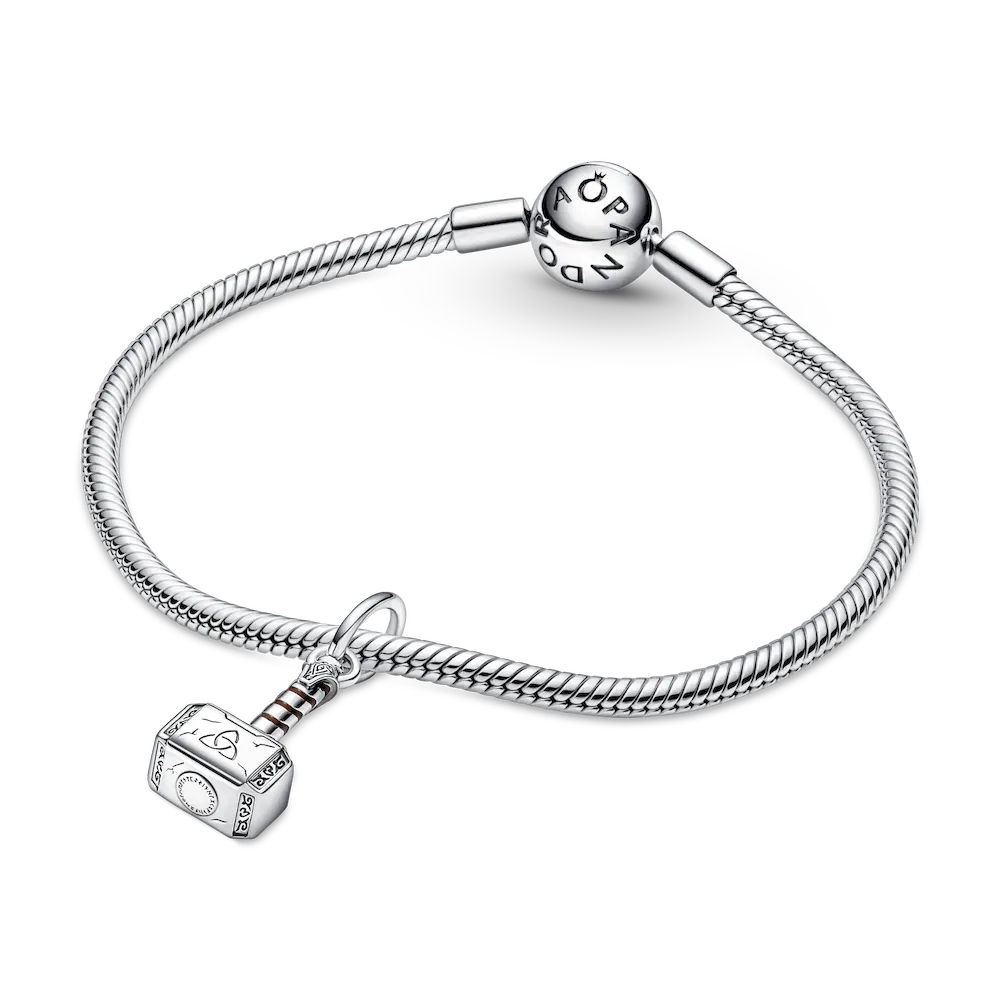 Bring the thunder with our Marvel The Avengers Thor’s Hammer Dangle Charm and share your love for the Marvel Cinematic Universe with the world. Hand-finished in sterling silver, Thor’s hammer is brought to life with swirling brown enamel, engraved scratch marks and Asgardian-style rune symbols. The side of the hammer is engraved with “Worthy” as a reminder of the source of Thor’s power. Add this charm and more of your favorite heroes to our Pandora Moments Marvel The Avengers Logo Clasp Snake Chain Bracelet.