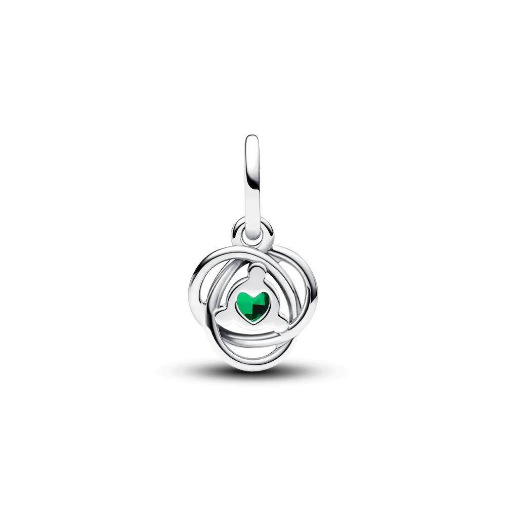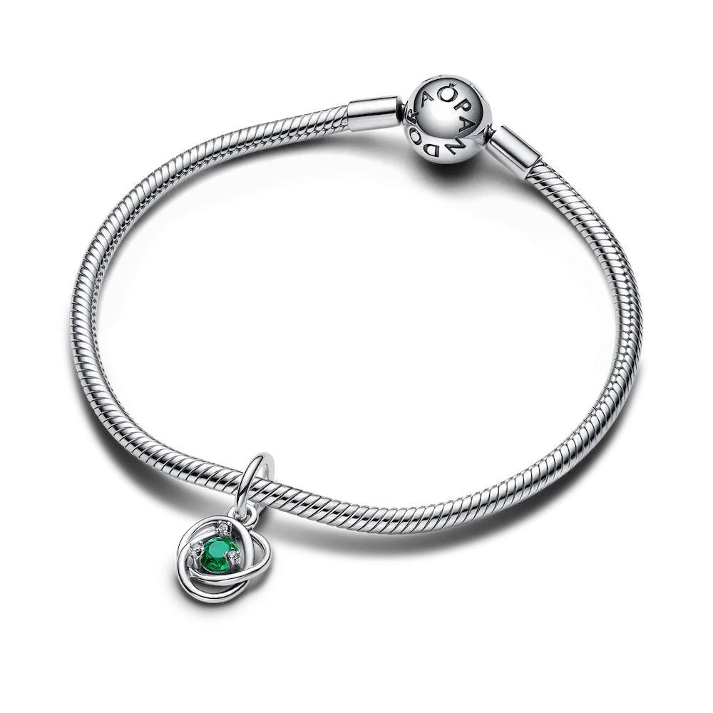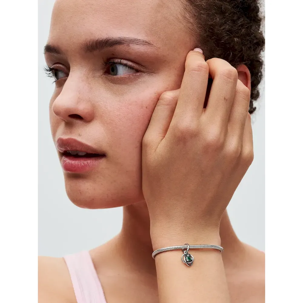 Introducing a new addition to the Eternity Circle family with our Stones of the Month dangle charms. Inspired by unconditional love and power, this intricate knot design features openwork infinity braiding around May’s deep green man-made crystal at the center. Surrounded by three small cubic zirconia stones on the front and a cut-out heart shape on the back for maximum sparkle. This dazzling dangle charm comes on a matching sterling silver Pandora Moments Snake Chain Slider Bracelet. Capture the symbolism of a May birthday, milestone or anniversary with this vibrant set. Unconditionally. Infinitely. Be love.