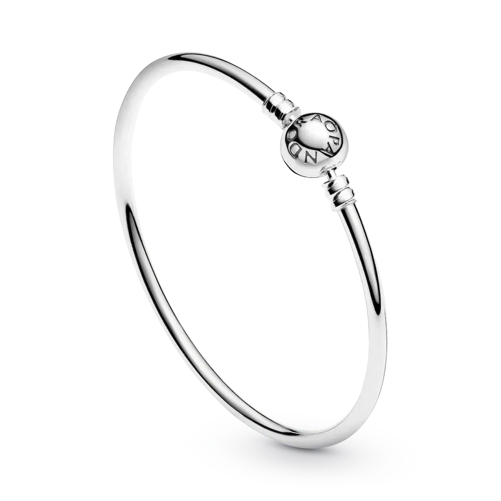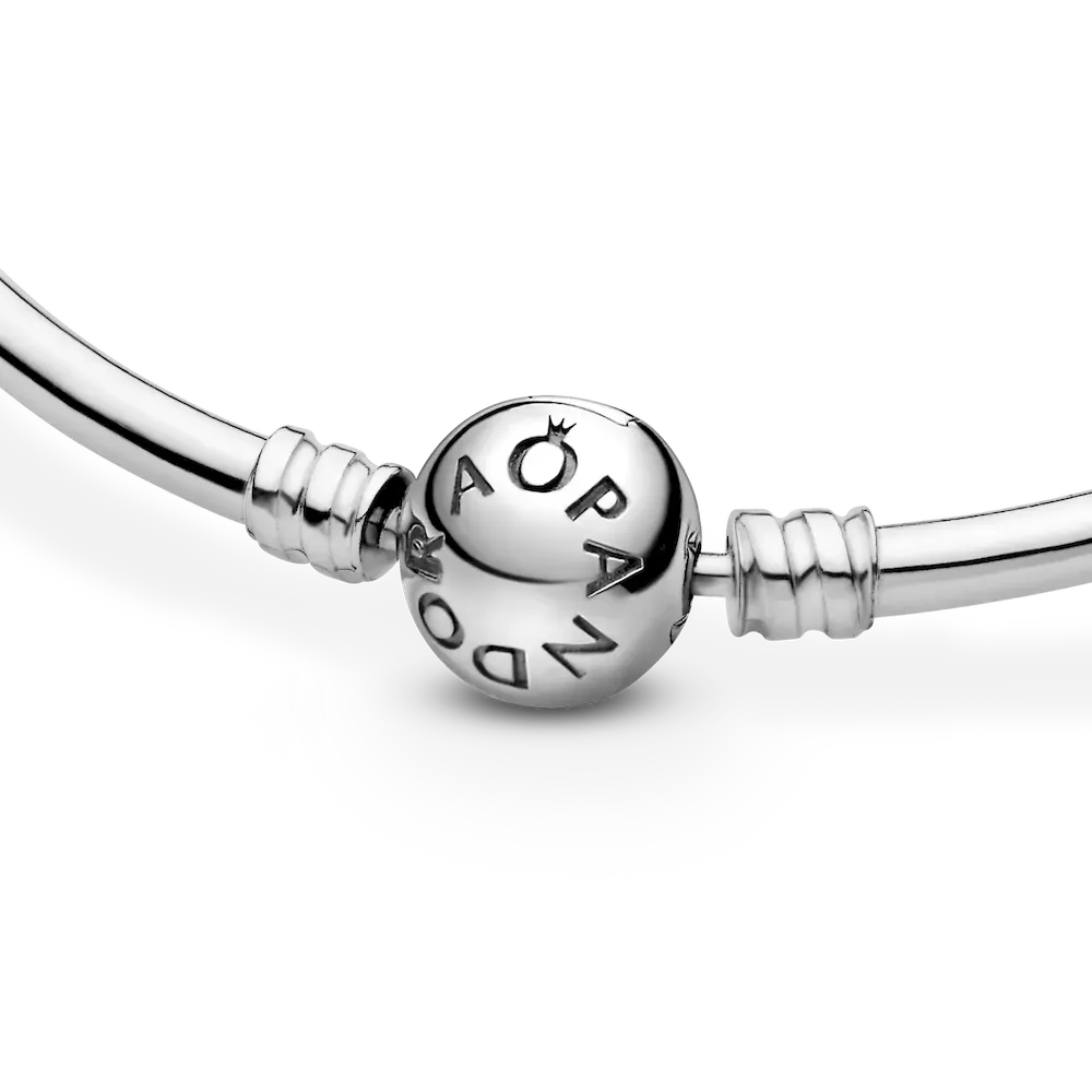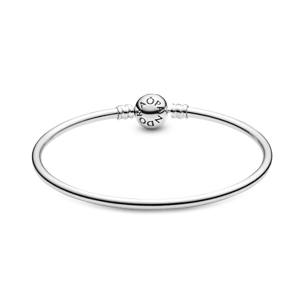 Sleek and elegant, this Pandora Moments bangle is simply beautiful. Crafted in polished sterling silver, it is finished with an embossed ball clasp. Wear this Pandora bangle on its own or create your dream bracelet by adding your personal collection of Moments charms.