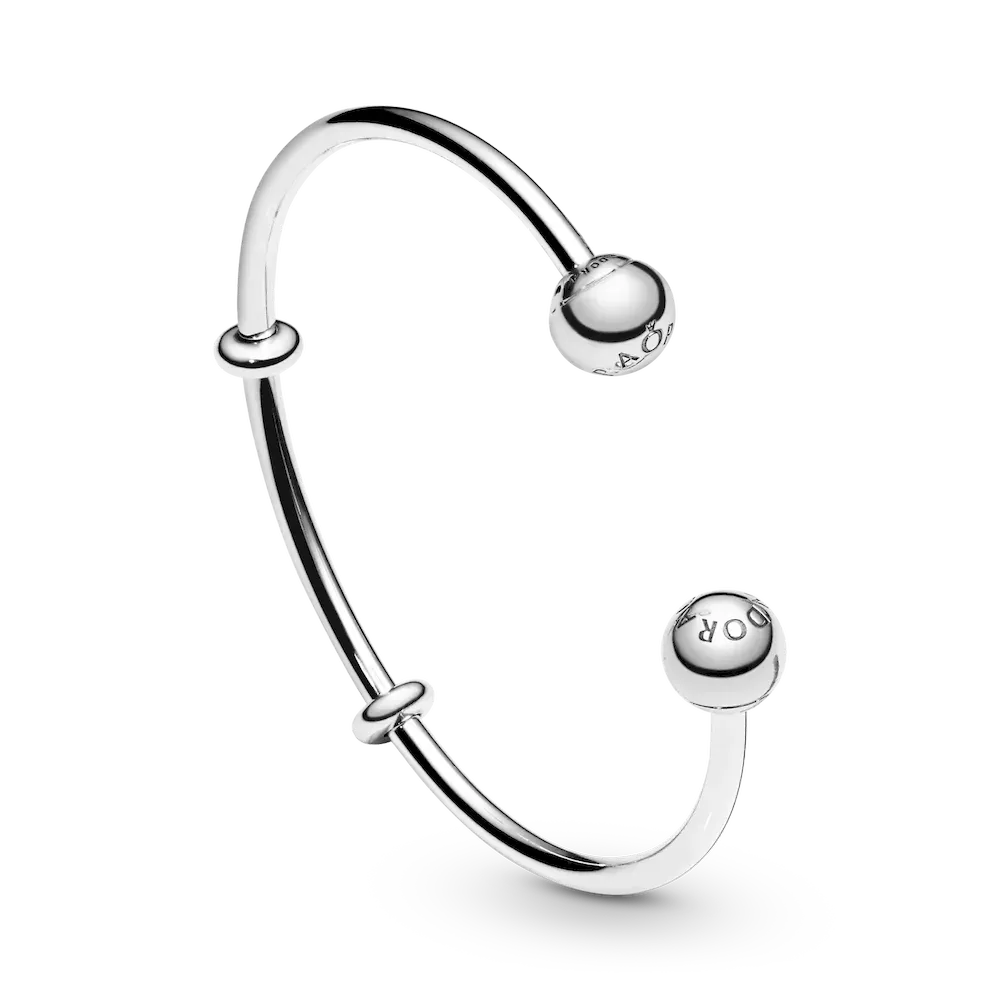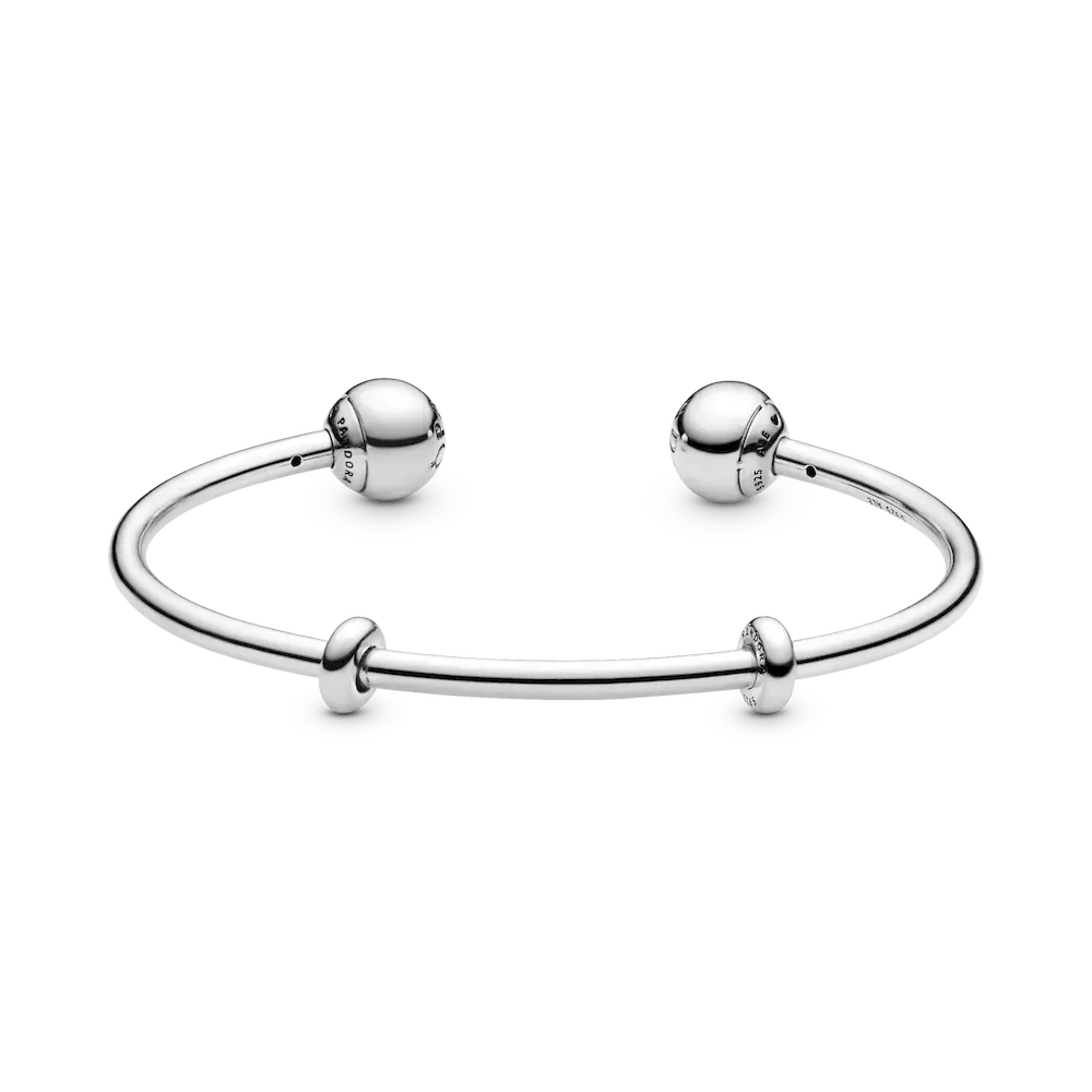 The classic charm bracelet is reinvented with this stunning Pandora open bangle – modern, sophisticated and easier than ever to wear. Crafted in sterling silver, this sleek style features embossed end caps to secure your treasures in place. Wear this Pandora bangle on its own, adorned with your favorite charms or layered with other bracelets as a bold statement.