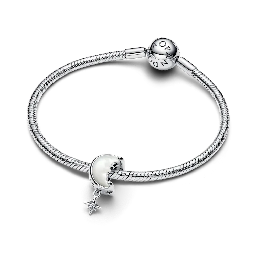 Let the night sky be your guide with our Moon and North Star Charm. The moon, crafted from man-made bioresin mother of pearl with peaceful facial details, rests in a sterling silver setting featuring cut-out stars. The North Star dangles beneath the moon, shining bright with a single brilliant-cut stone set in its centre.