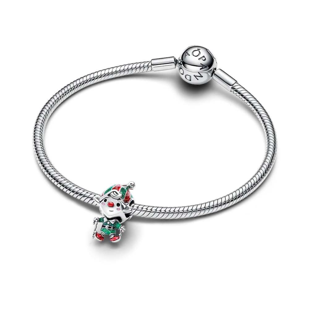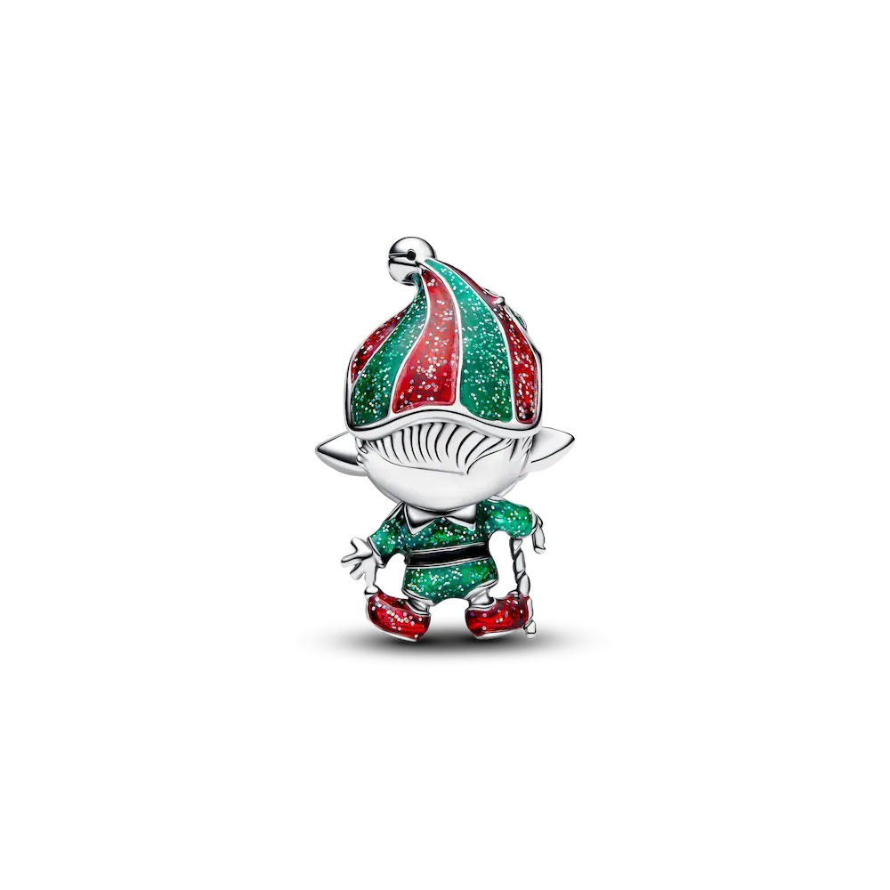 Meet your playful holiday guardian. This sterling silver charm features a moveable elf with vibrant, glittery enamel in festive colors. Crafted with intricate details, it adds a magical touch to your collection.