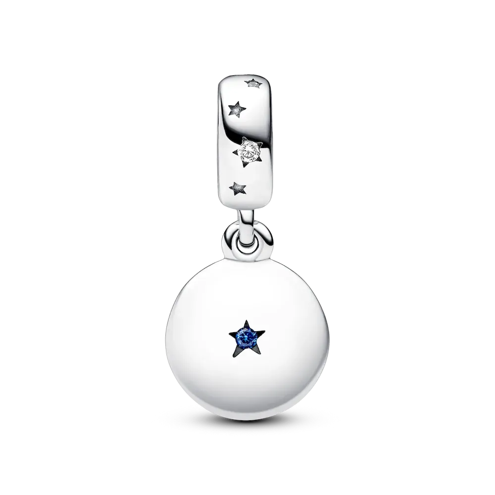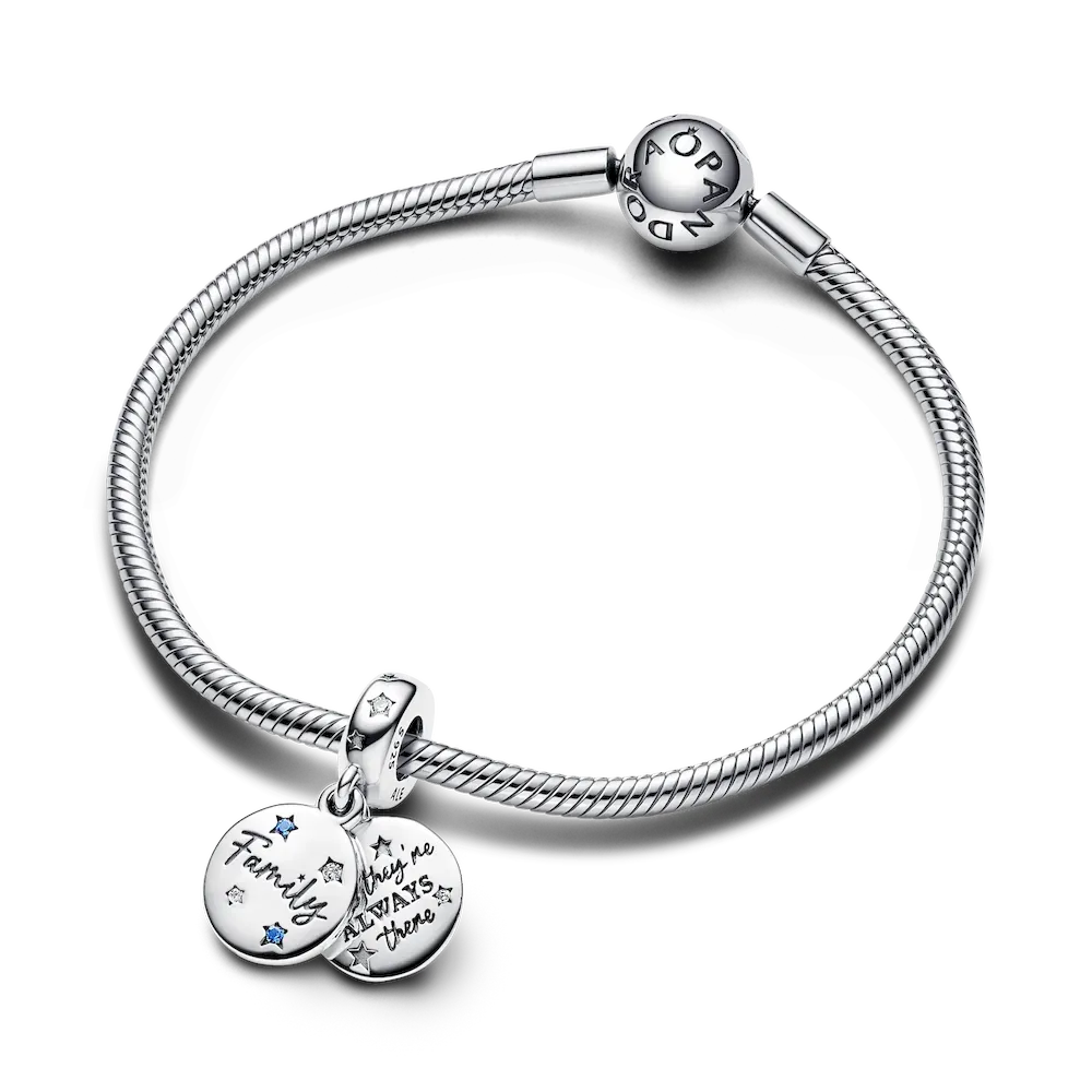 Unbox a message of love with the My Family My Universe Charm Duo. Crafted in sterling silver, this set features an openwork family heart charm with cut-out stars and hearts along the sides. Beautifully paired with our family love double dangle charm, made with sparkling cubic zirconia and stellar blue man-made crystals that twinkle like stars. Show your family that love knows no distance.