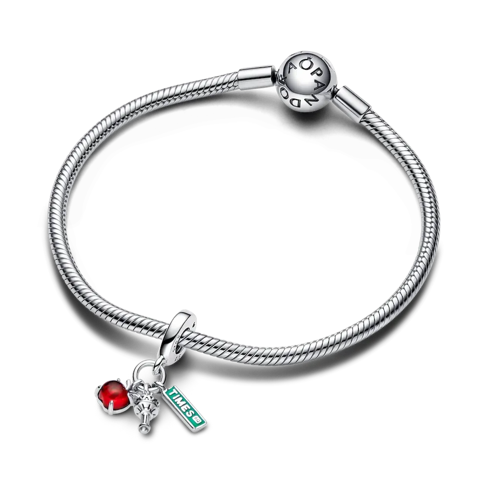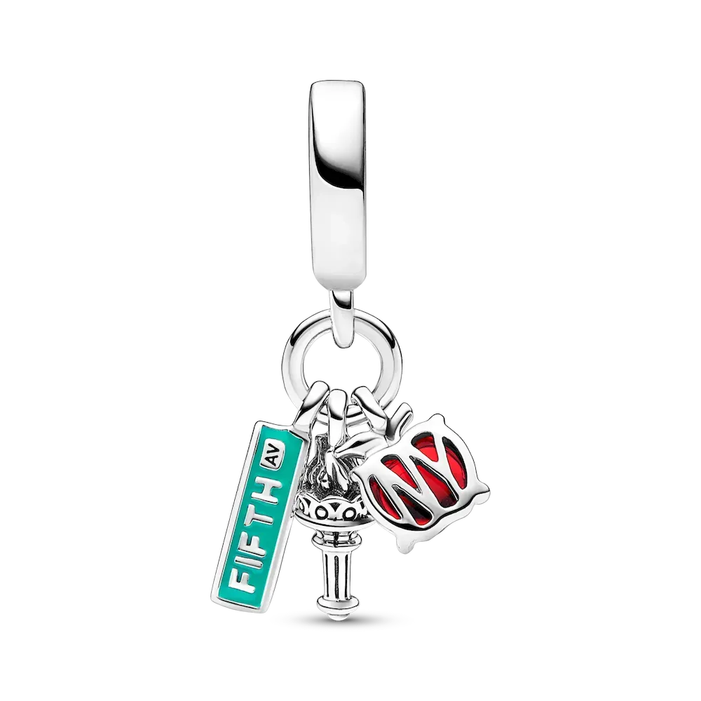 Mark your favorite memories with the NYC Apple, Torch and Street Sign Triple Dangle Charm. Carry the unmistakable atmosphere of the Big Apple with you with this sterling silver dangle charm featuring symbols of New York City. Combining a red Murano glass apple, the Statue of Liberty’s famous torch and the famous Fifth Av. street sign design in blue green enamel, this Pandora dangle charm symbolizes the endless dreams the city holds. Bring home a small piece of the big city for yourself or someone close to your heart.