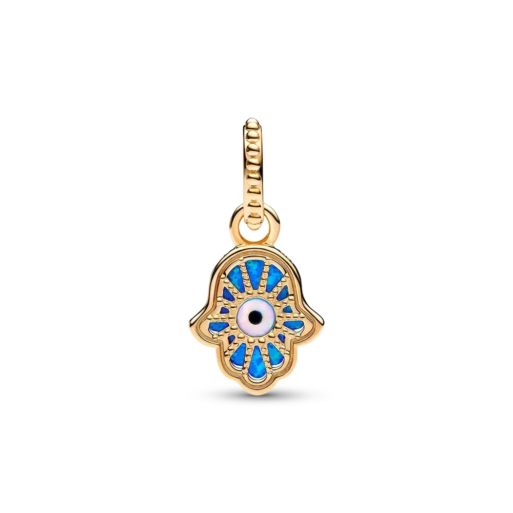 Ancient symbol, new vibe. Wear the Opalescent Blue Hamsa Hand Dangle Charm to represent protection and surrounding yourself with positive energy. This 14k gold-plated Hamsa charm showcases a shimmering deep blue lab-created opal. On one side is an openwork sun ray design radiating from an all-seeing eye motif at the center with white lab-created opal. Traditionally worn as a talisman to defend against evil, the dangling hand is a gesture of welcoming kindness, friendship and grace into your life.