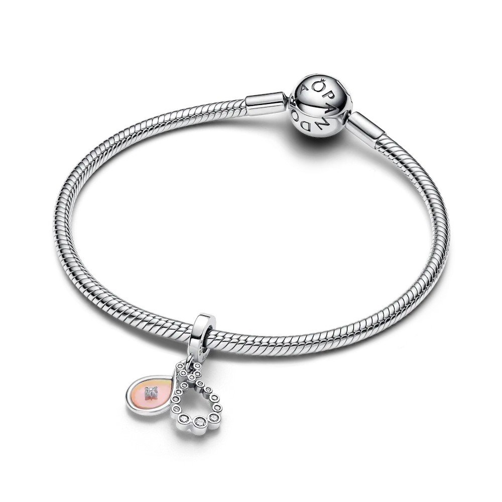 This sterling silver double dangle sparkles with clear cubic zirconia on one charm and aurora lab-grown opal resin on the other. Engraved with ‘LOVE TIMES INFINITY’, wear it as a reminder of everlasting connections.