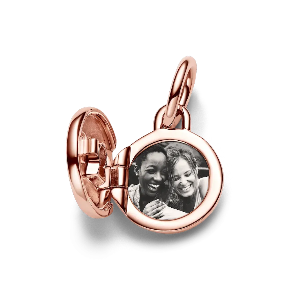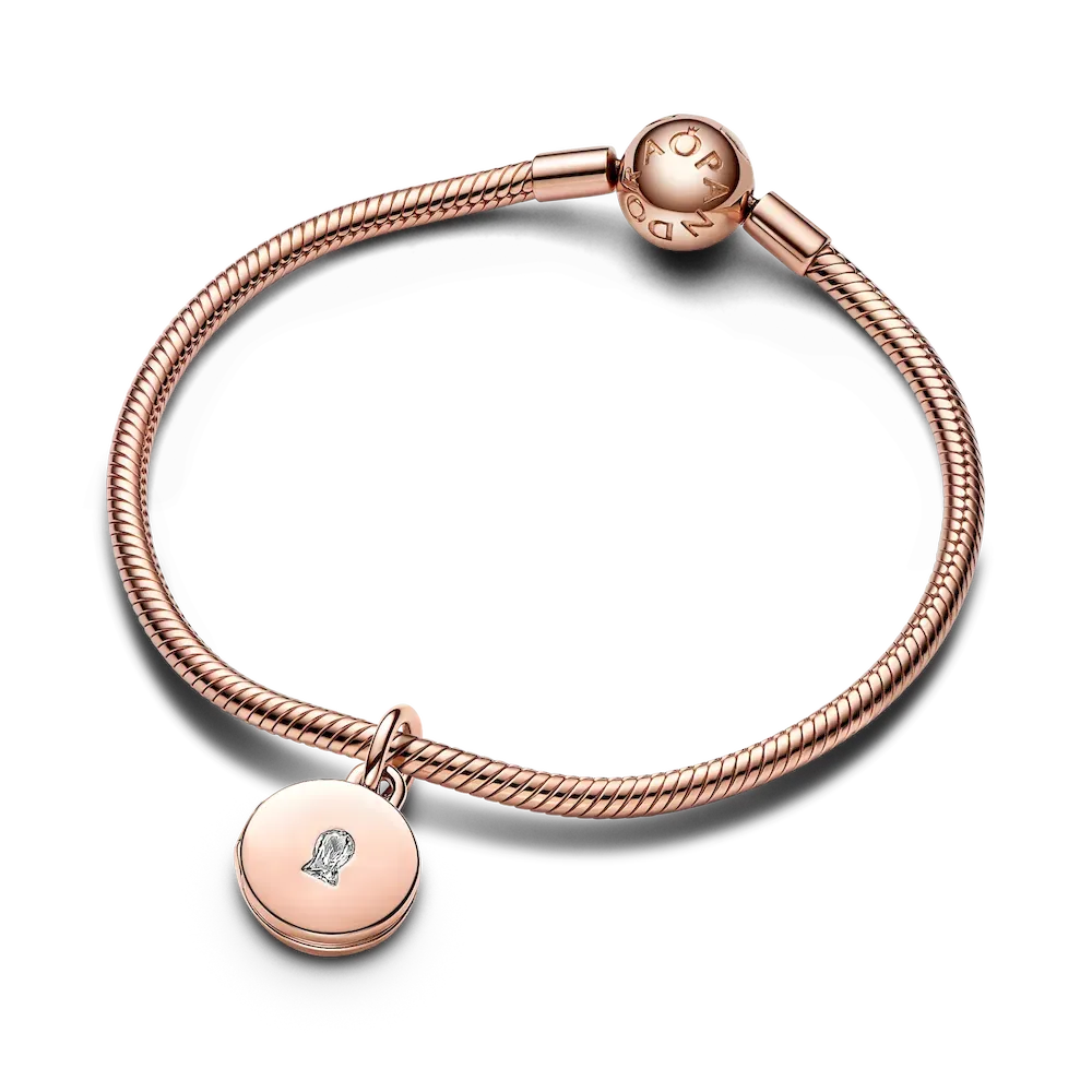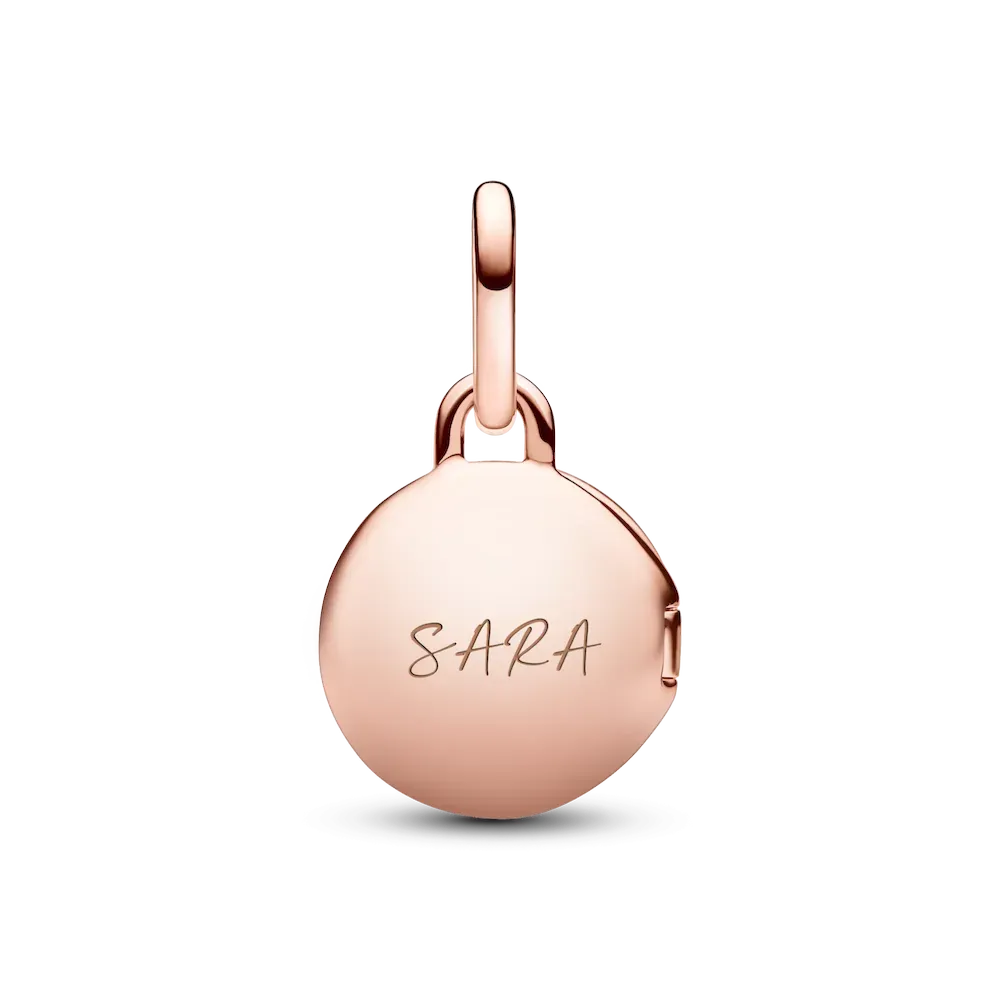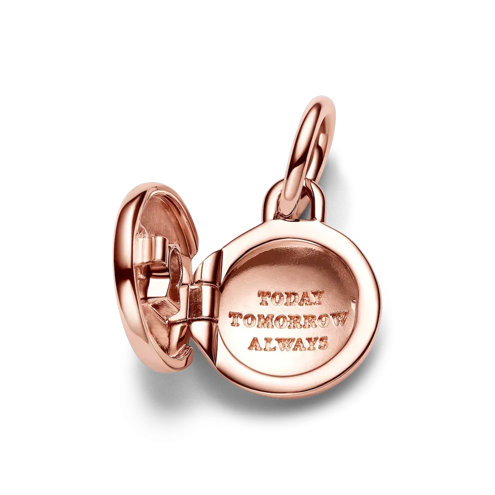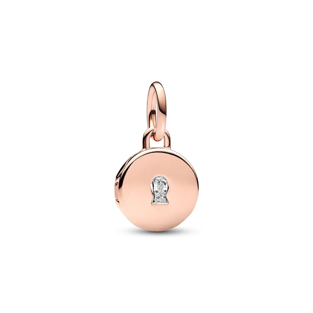 Keep what’s most dear to you close to your heart with the Openable & Engravable Love Locket Dangle Charm. This 14k rose gold-plated locket charm features a clear cubic zirconia stone on the front in the shape of a keyhole, and opens and closes securely so you can keep a tiny picture, note or lock of hair inside. The inside of the locket is engraved with the message