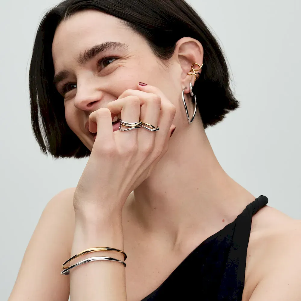 The Organically Shaped Bangle is a sleek style essential. This 14k gold-plated bangle features a wavy profile that varies in thickness, creating a sense of movement and a subtle undulating effect. Inspired by the natural lines and curves found in nature, this modern piece is effortlessly elegant. Stack this bangle up the arm with your other favorite bracelets and bangles, or let it stand alone as a lesson in simple beauty.
