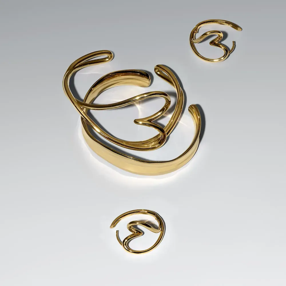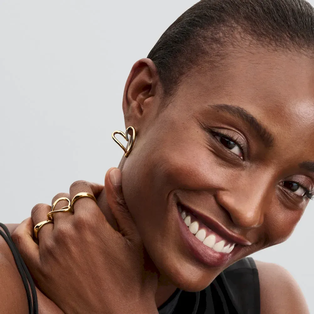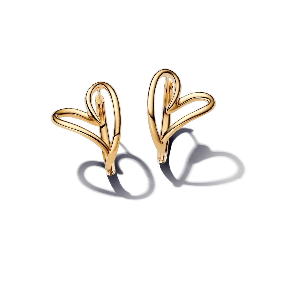Love is in your nature. These organically shaped hoop earrings feature abstract openwork hearts in 14k gold plating, inspired by the fluid shapes of the natural world. The earrings are sold as a pair and mirror each other. A simple click closure makes them effortless to wear. Pair them with the matching bangle and ring for a modern take on an enduring symbol of love.