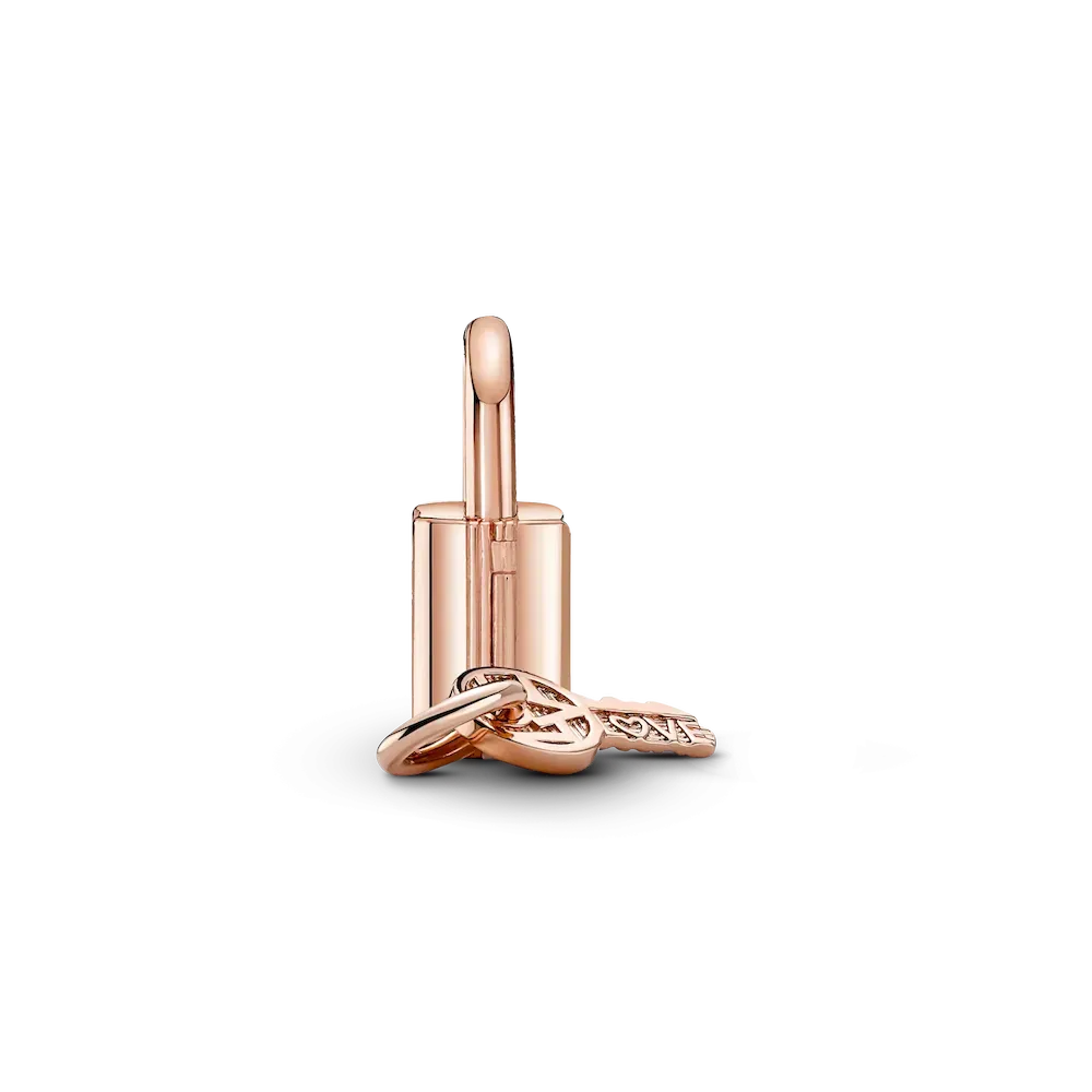 Cherish the special connection you share with loved ones with this Padlock and Key Dangle Charm. Featuring two parts, the key is also a charm in itself. Place it next to the padlock and style the two together on your jewelry, or gift it to a loved one, so only they have the power to unlock your padlock. Inspired by the locks placed on bridges by lovers all around the world, this 14k rose gold-plated Padlock and Key Charm is the perfect way to capture your love. Compatible with necklaces and bracelets, wear yours around your neck as a pendant or as a charm on your bracelet and let the one you love carry the key to your padlock – and your heart. Please note: the key should not be worn inside the padlock.