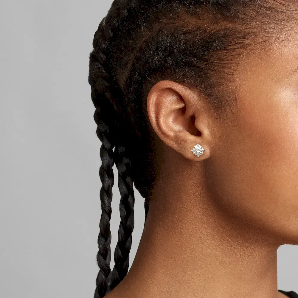 A fresh twist on a classic. The Pandora Era 14k White Gold Lab-grown Diamond Earrings are sold as a pair and feature a 0.50 carat round brilliant excellent cut lab-grown diamond in each earring, with a total carat weight of 1.00. Each stone is held by a four-prong setting that combines round and flat profiles, creating a modern aesthetic and opening it to the light for amplified sparkle. These 14k white gold earrings are a universally wearable jewelry box essential that will elevate your looks day and night for years to come. Each Pandora Lab-grown diamond is treated with a post-growth color enhancement called annealing.