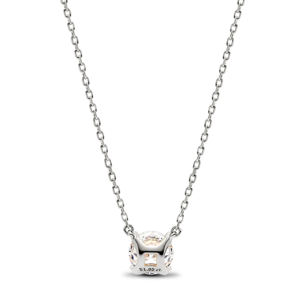 A fresh twist on a classic. The Pandora Era 14k White Gold Lab-grown Diamond Pendant Necklace showcases a 1.00 carat round brilliant excellent cut lab-created diamond in a four-prong setting that combines round and flat profiles, creating a modern aesthetic and opening the stone to the light for amplified sparkle. The 14k white gold pendant is fixed to a matching diamond-cut cable chain, adjustable to two lengths. This lab-grown diamond necklace is a universally wearable piece that will elevate your looks day and night for years to come. Each Pandora Lab-grown diamond is treated with a post-growth color enhancement called annealing.