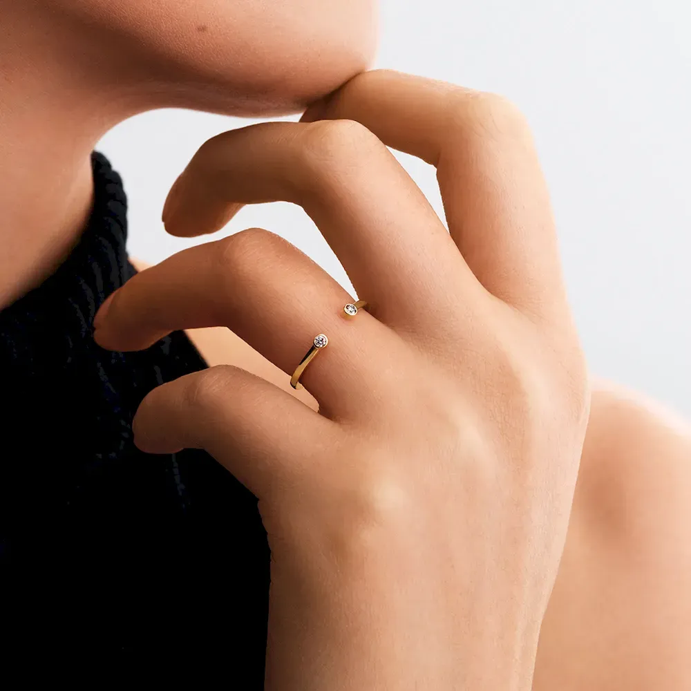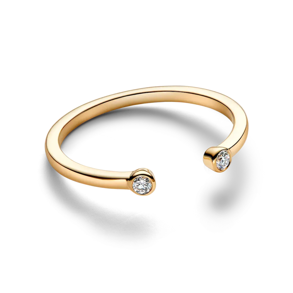 An elevated diamond stacking ring that embodies a minimalist aesthetic. Crafted from solid 14k gold, this ring features two bezel-set lab-grown diamonds on each end of the open ring band. The perfect stacking piece to pair with other Pandora Era designs, like the Pandora Era Lab-Grown Diamond Trio Ring.
