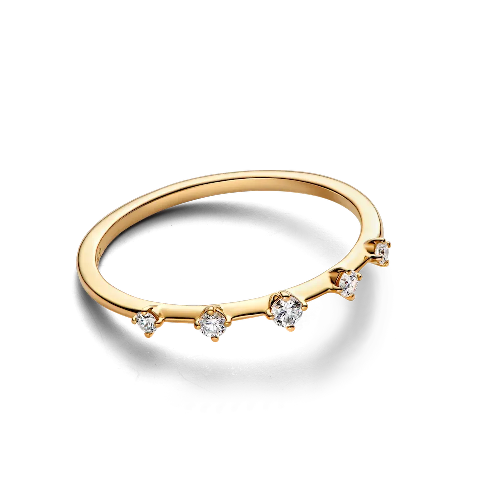 The Pandora Era Lab-Grown Diamond Station Ring features a delicate 14k gold band adorned with five prong-set round brilliant lab-grown diamonds. Graduated in size, the larger center stone adds a focal point that effortlessly elevates your style. Pair it with other rings for a layered look that maximizes on radiance.