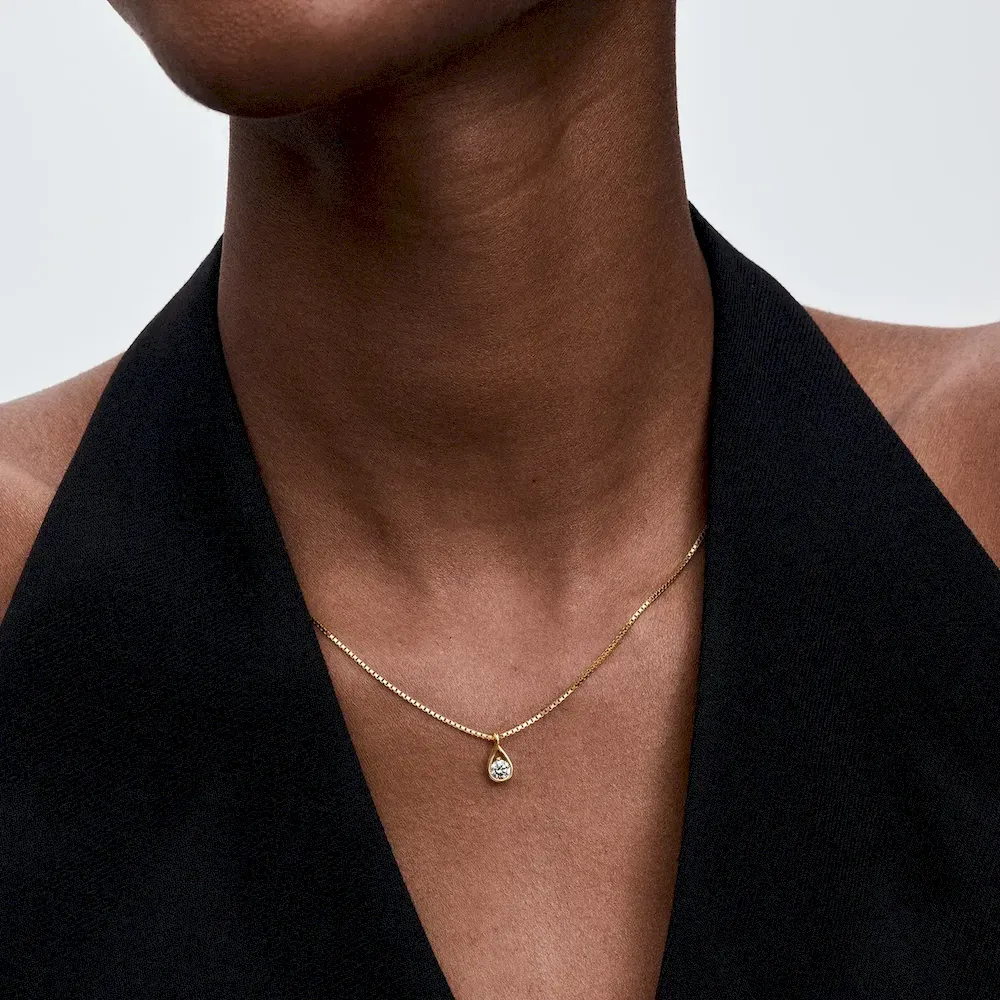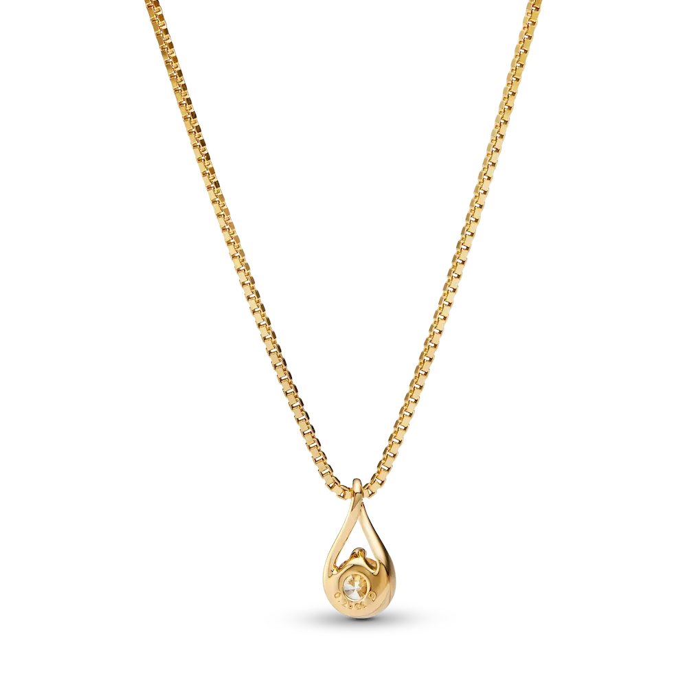 This 14k gold pendant is hand-set with a radiant 0.25 carat lab-grown diamond on a matching 14k gold box chain necklace. A powerful reminder of all we are, all we can be and the infinite possibility the future holds, this pendant features a round brilliant excellent cut lab-grown diamond in a modern infinity setting that flows around the stone and suspends it in mid-air. An elevated piece that will shine on any neckline. Each Pandora Lab-grown diamond is treated with a post-growth color enhancement called annealing.