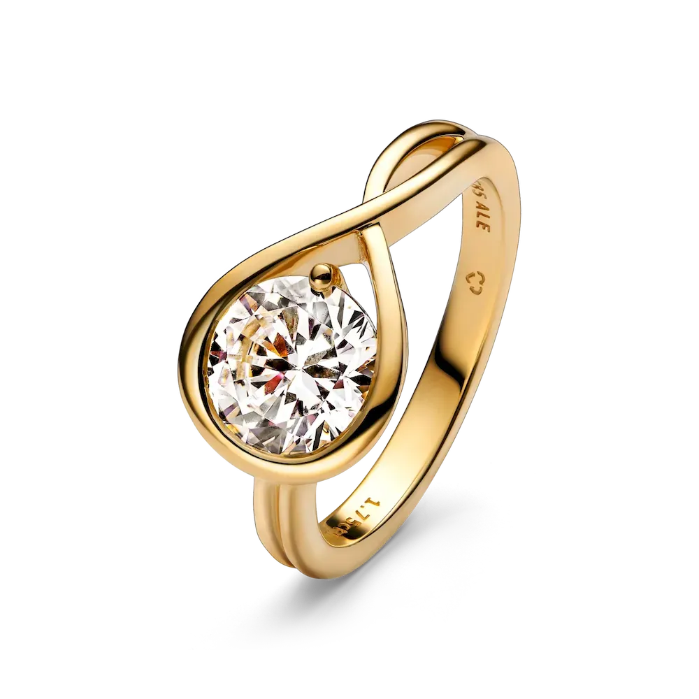 A solid 14k gold ring hand-set with a 1.75 carat lab-grown diamond. A beautiful statement of empowerment, or an eloquent declaration of love. A modern infinity setting flows seamlessly around the round brilliant excellent cut stone.