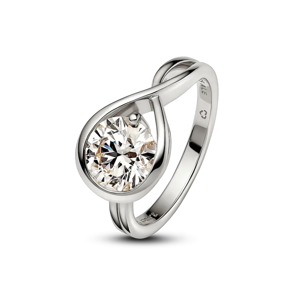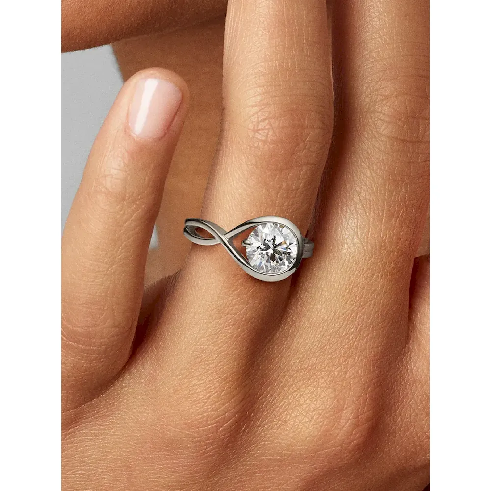 A solid 14k white gold ring hand-set with a 2.00 carat lab-grown diamond. A beautiful statement of empowerment and possibility, or a simple yet eloquent declaration of love. This ring features a scintillating round brilliant excellent cut lab-grown diamond in a modern infinity setting that flows seamlessly around the stone. It can be worn alone or stacked with other rings from the Pandora Infinite collection. Pandora Infinite lab-grown diamonds at and above 0.50 carat are certified by IGI. Each Pandora Lab-grown diamond is treated with a post-growth color enhancement called annealing.