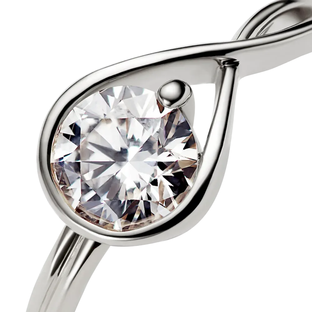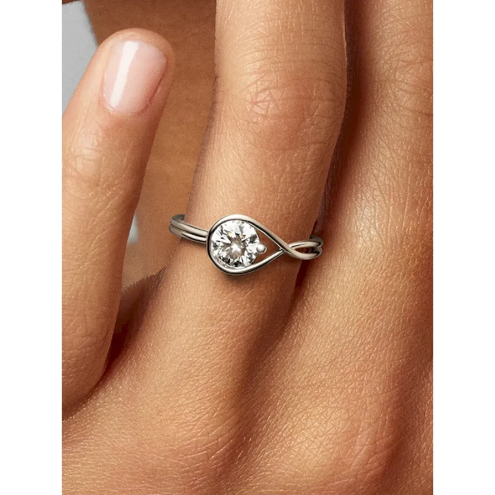 A solid 14k white gold ring hand set with a 1.00 carat lab-grown diamond. A beautiful statement of empowerment and possibility, or a simple yet eloquent declaration of love. This ring features a scintillating round brilliant excellent cut lab-grown diamond in a modern infinity setting that flows seamlessly around the stone. It can be worn alone or stacked with other rings from the Pandora Infinite collection. Pandora Infinite lab-grown diamonds at and above 0.50 carat are certified by IGI. Each Pandora Lab-grown diamond is treated with a post-growth color enhancement called annealing.