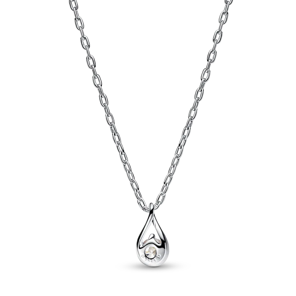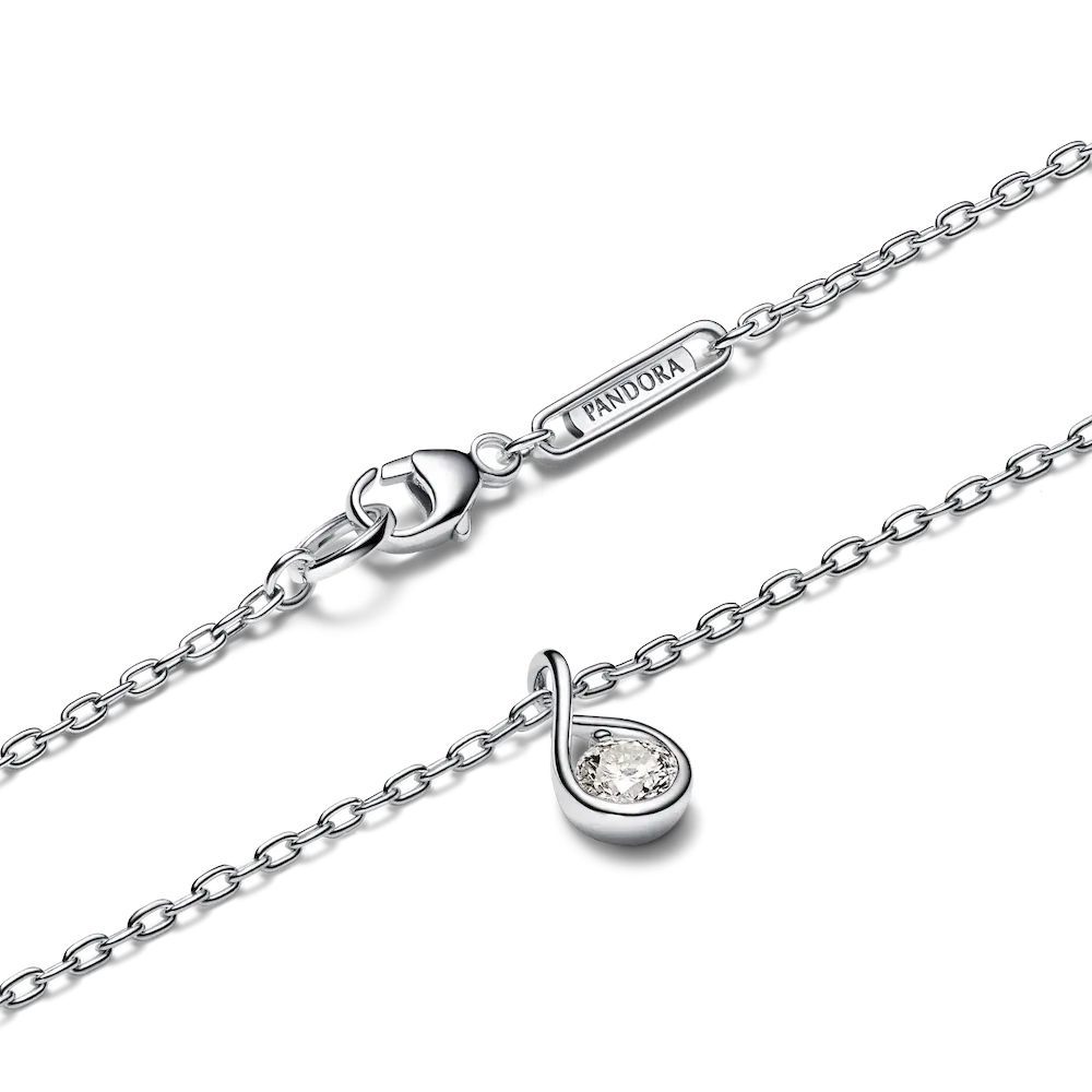 A solid sterling silver pendant hand set with a 0.25 carat lab-grown diamond on a matching sterling silver necklace. A powerful reminder of all we are, all we can be, and the infinite possibility the future holds. This pendant features a fiery round brilliant excellent cut lab-grown diamond in a modern infinity setting that flows around the stone and suspends it in mid-air. The chain is easily adjustable to two lengths. Each Pandora Lab-grown diamond is treated with a post-growth color enhancement called annealing.