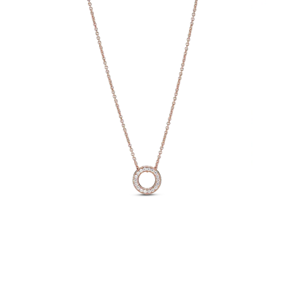 Celebrate the Pandora Signature range with the Pandora Logo Pavé Circle Collier Necklace. This 14k rose gold-plated reversible piece with an open centre is highly detailed and hand-finished. On one side of the circle, there are clear cubic zirconia. The polished reverse side features an engraving of the Pandora logo. With cut-out hearts on the sides of the circle, show your passion for classic design by wearing this adjustable Pandora logo necklace.