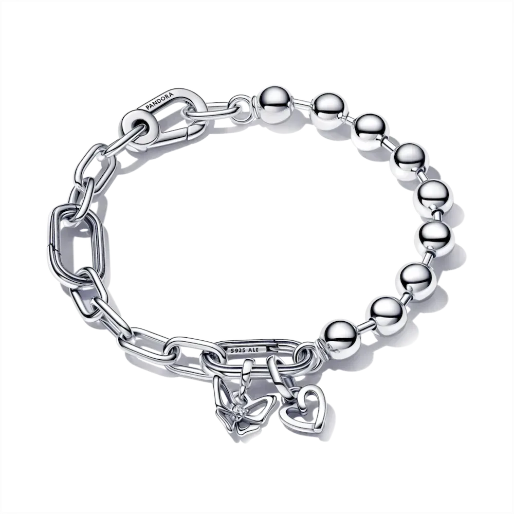 Keep your heart open and let your dreams fly with the Pandora ME Heart & Butterfly Bracelet Set. Featuring three sterling silver pieces – a metal bead and link chain bracelet, along with a heart mini dangle charm and a butterfly mini dangle charm – this combo is made for self-expression. Two universally iconic symbols, the heart and the butterfly, feature intricate details including microbeads and a sparkling stone. A perfect gift for yourself or a loved one, this is jewelry for every side of you.