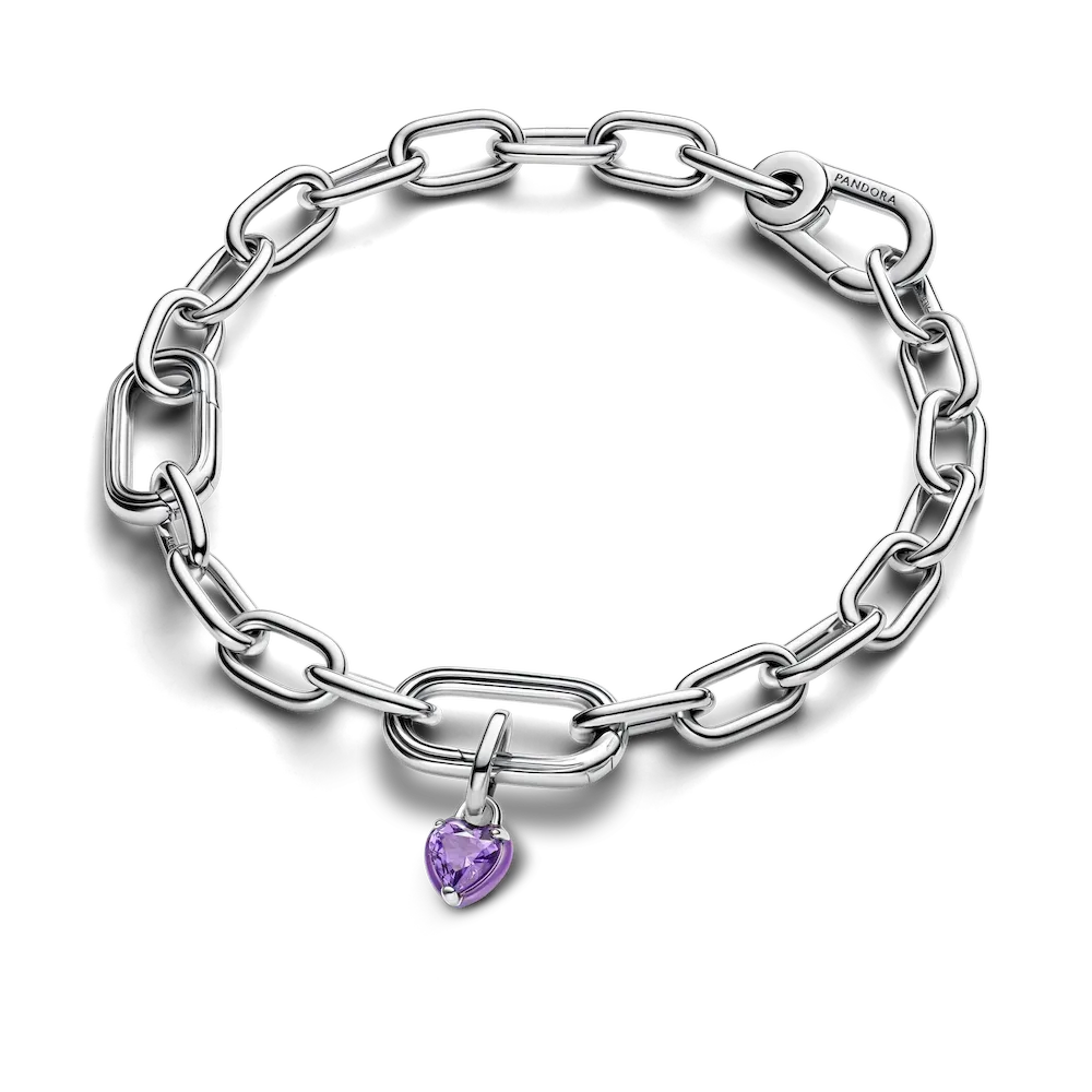 Love has no limits when you wear the Pandora ME Purple Chakra Heart Mini Dangle Charm. This sterling silver heart charm features purple hand-applied enamel and a purple heart-shaped man-made crystal. The reverse side features a sterling silver heart with grooved lines and cut-out detailing. A reminder that wild hearts can’t be broken, this mini dangle charm brings depth to your look, symbolizing that love – for yourself and others – always wins. Compatible with Pandora ME and Pandora Moments.