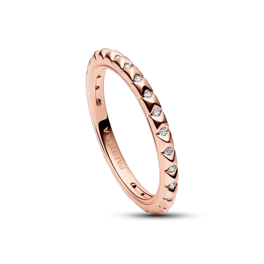 It’s rosé all day with the Pandora ME Pyramids Ring. This 14k rose gold-plated ring is punctuated by pyramid studs with clear cubic zirconia stones set between them. A grooved line along the edges of the ring adds a subtle, sleek design detail. Edgy yet elegant, this effortlessly cool piece will become a go-to option that works with everything, inspiring you to customise a fresh look every day.