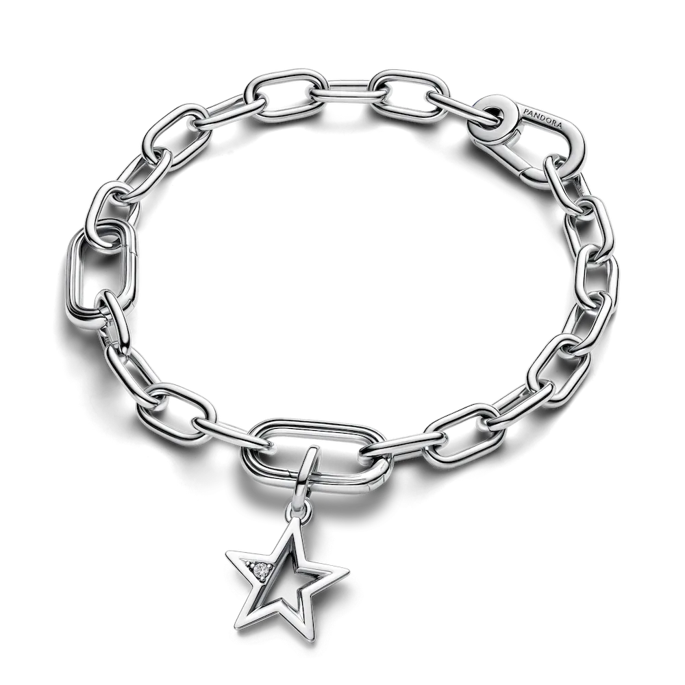 The stars are always aligned when you wear the Pandora ME Sparkling Star Medallion Charm. With a prism-shaped profile, this sterling silver star charm includes a sparkling stone hand-set in one of its five points. The reverse side features microbeads, a raised line and a triangle-shaped hole in the setting through which the stone is visible. Gift this medallion charm to someone who puts stars in your eyes, or wear it as a reminder that you’re the star of your universe. Compatible with Pandora ME and Pandora Moments.