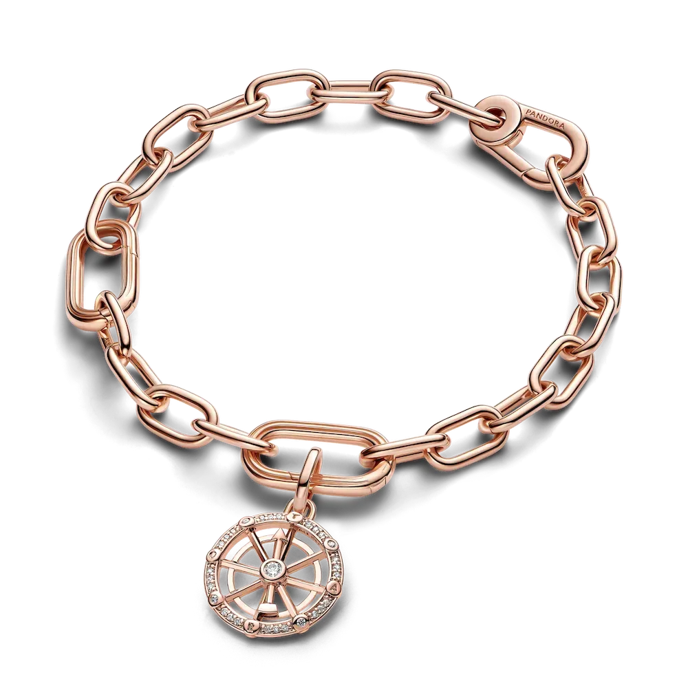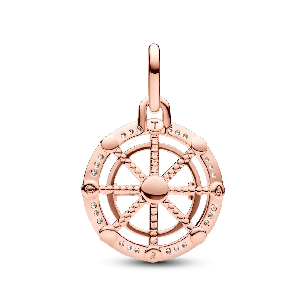 Seek your fortune with the Pandora ME Wheel of Fortune Medallion Charm in 14k rose gold plating. Symbolising good luck and karma, this 8-point wheel charm has a movable arrow at the centre – spin it to point toward your chosen destiny. Engraved on the four points of the wheel are the letters T, A, R and O, inspired by the letters on some versions of the Wheel of Fortune tarot card. It can be read in a circle as TAROT, with the T repeated. This medallion charm can be styled on Pandora Moments charm holders and openable links on Pandora ME carriers.