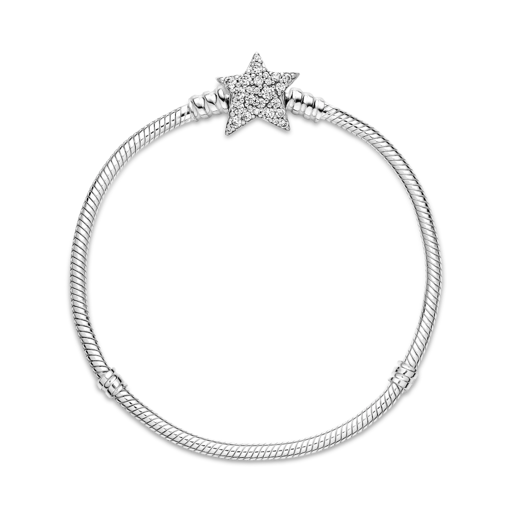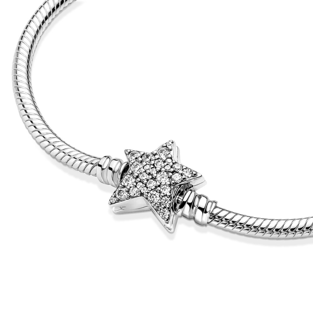 Bring celestial sparkle to your look with the Pandora Moments Asymmetric Star Clasp Snake Chain Bracelet. Hand-finished in sterling silver, the bracelet’s star-shaped clasp is covered by sparkling clear cubic zirconia pavé on both sides. It can be worn with up to 16-18 desired charms and clips. Wear it on its own for a simple, understated look, or stack it with other celestial-inspired designs for a look that’s out of this world.