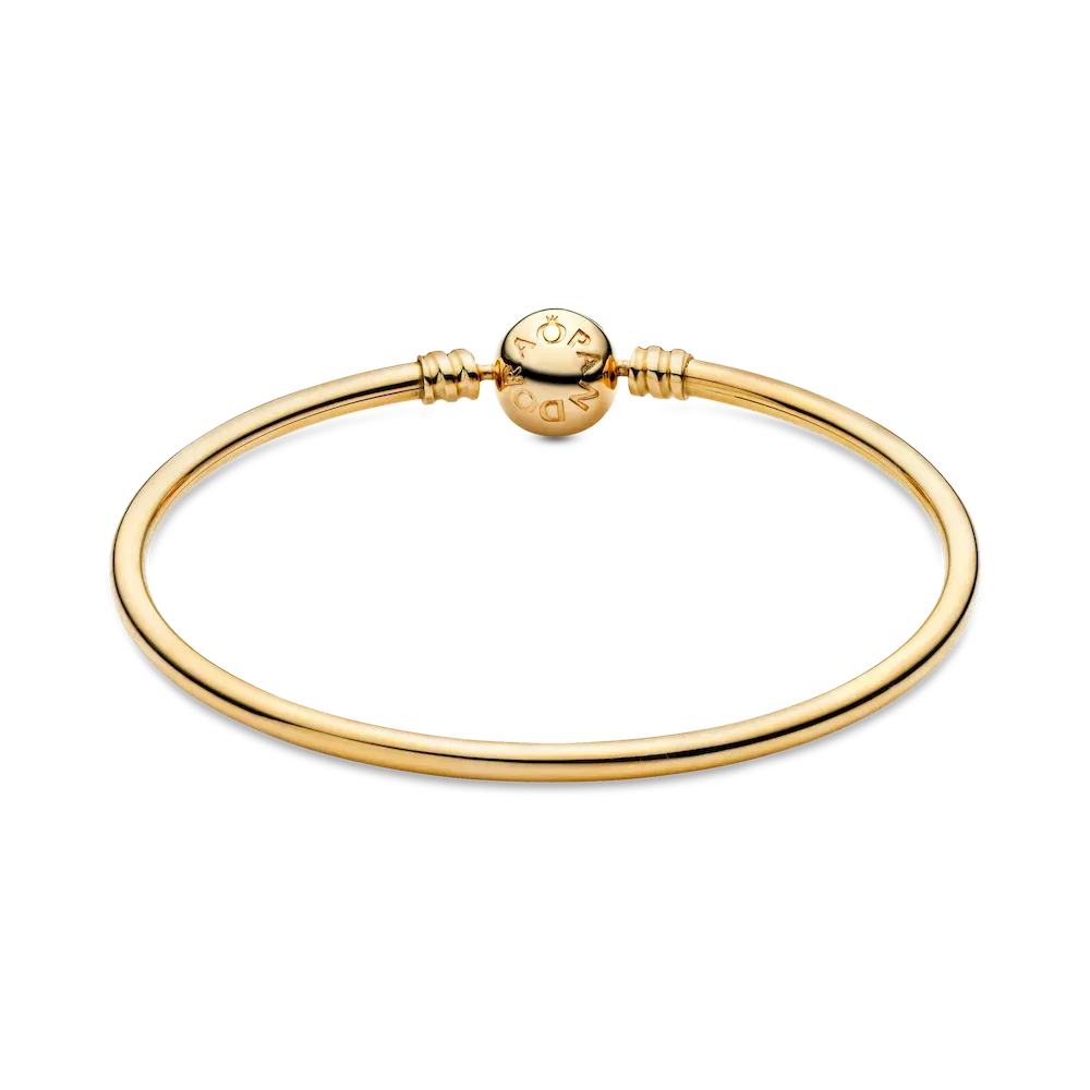 Our signature bangle for Pandora Moments charms is a luxe addition to your everyday jewelry look. The sleek style is expertly crafted from solid 14k gold, hand-finished and buffed to a high shine. It’s fitted with our classic logo ball clasp that underpins the minimalist aesthetic. Wear it with or without charms, solo or stacked.