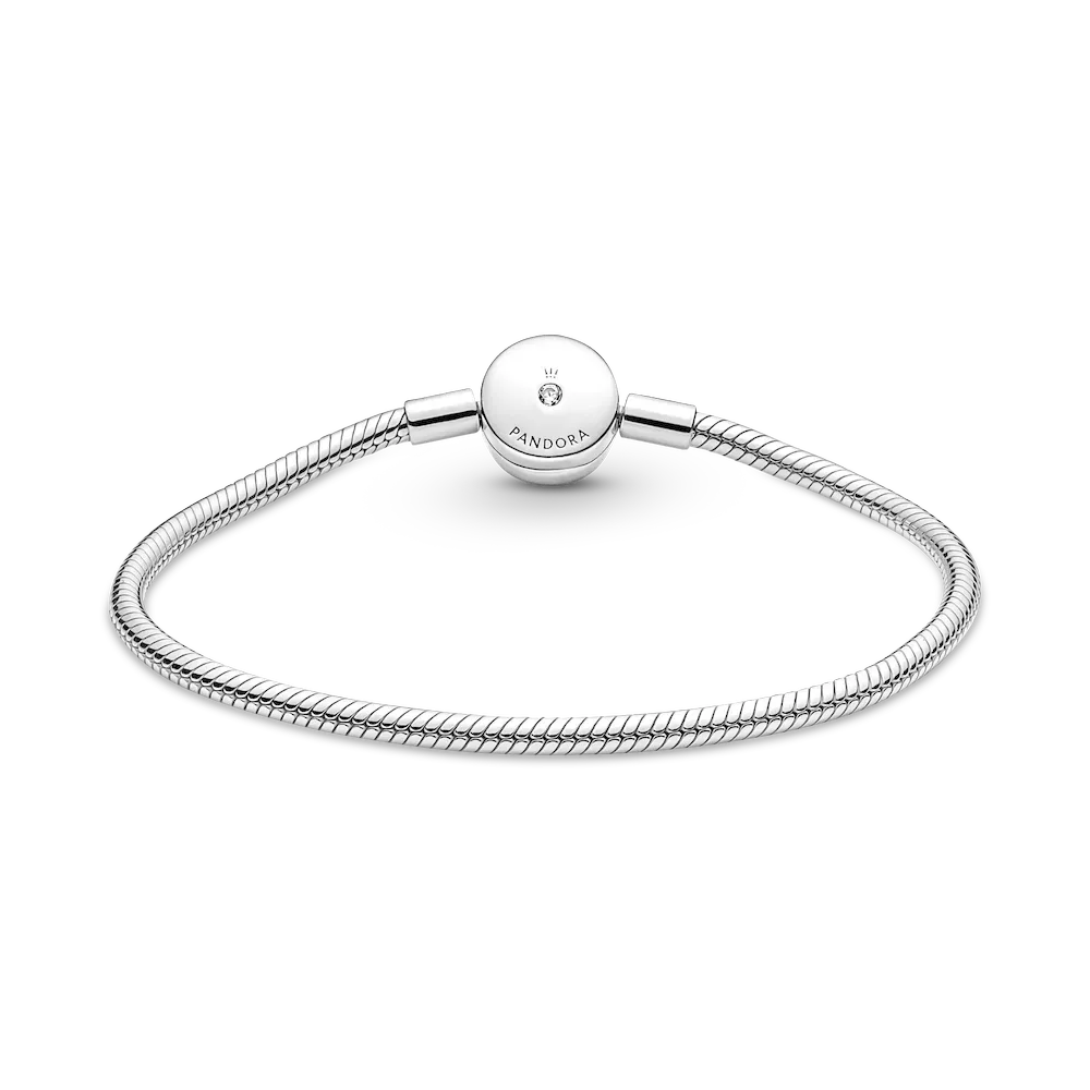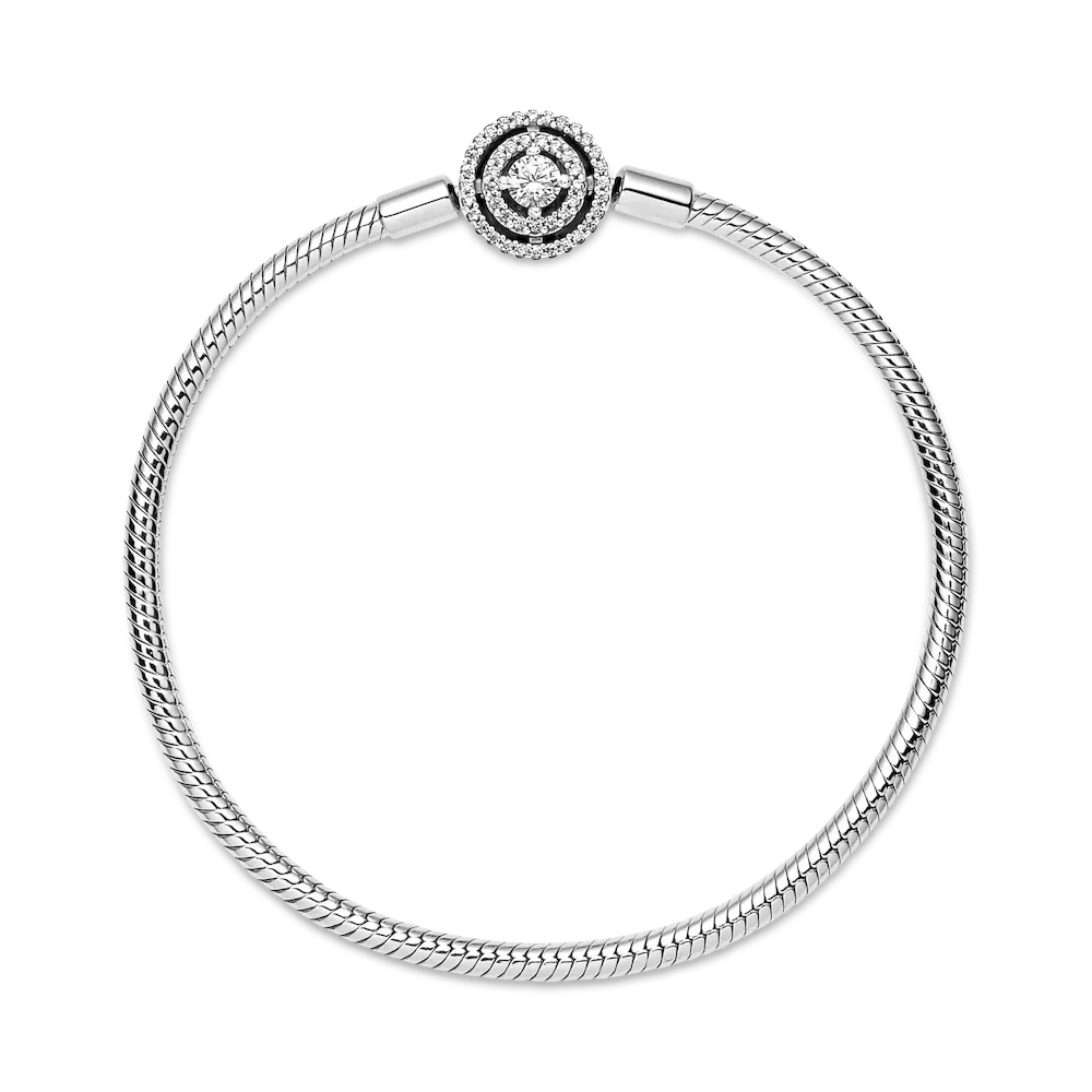 Bring timeless charm to your look with the Pandora Moments Halo Snake Chain Bracelet. Hand-finished in sterling silver, the bracelet’s clasp features a large sparkling clear cubic zirconia center stone surrounded by a double halo set with small stones, designed to create a spacious, free-floating look. Fill the bracelet with charms and clips, wear it on its own for a simply elegant look, or stack it with contrasting bracelets for a fun play on textures.