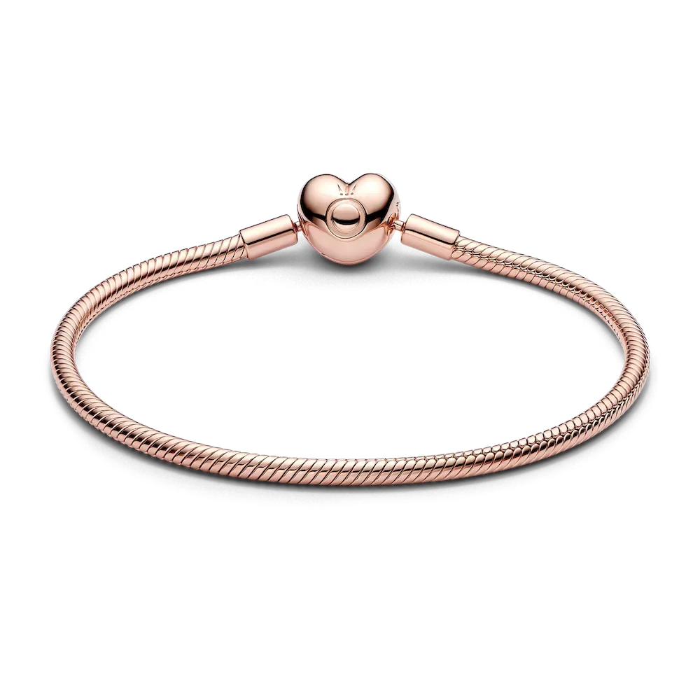 Make your story shine with the Pandora Moments Heart Clasp Snake Chain Bracelet. Our iconic snake chain bracelet gets a gleaming update in 14k rose gold plating, with a polished heart-shaped clasp. The clasp includes an engraved Pandora logo on one side and the Pandora Crown O logo on the other. Style this Pandora snake chain bracelet with up to 16 to 18 charms for an iconic everyday look that is all yours.